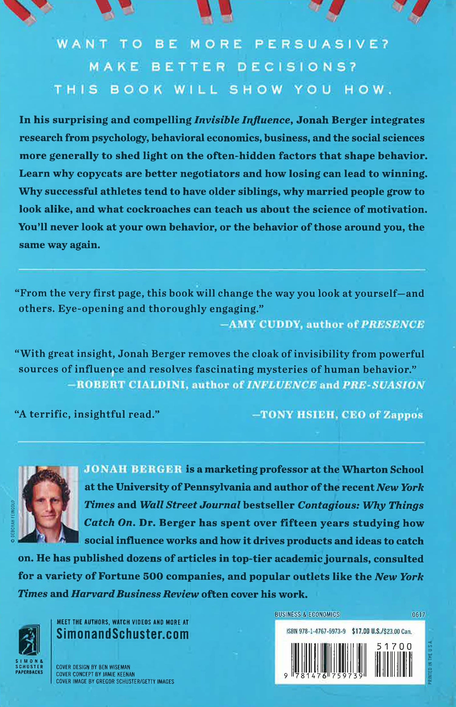 Jonah Berger, the bestselling author of Contagious, explores the subtle, secret influences that affect the decisions we make--from what we buy, to the careers we choose, to what we eat--in his latest New York Times bestseller that is a "rare business book that's both informative and enough fun to take to the beach" (Fortune.com). If you're like most people, you think your individual tastes and opinions drive your choices and behaviors. You wear a certain jacket because you liked how it looked. You picked a particular career because you found it interesting. The notion that our choices are driven by our own personal thoughts and opinions is patently obvious. Right? Wrong. Without our realizing it, other people's behavior has a huge influence on everything we do at every moment of our lives, from the mundane to the momentous. Even strangers have an impact on our judgments and decisions: our attitudes toward a welfare policy shift if we're told it is supported by Democrats versus Republicans (even though the policy is the same). But social influence doesn't just lead us to do the same things as others. In some cases we imitate others around us. But in other cases we avoid particular choices or behaviors because other people are doing them. We stop listening to a band because they go mainstream. We skip buying the minivan because we don't want to look like a soccer mom. By understanding how social influence works, we can decide when to resist and when to embrace it--and learn how we can use this knowledge to exercise more control over our own behavior. In Invisible Influence, Jonah Berger "is consistently entertaining, applying science to real life in surprising ways and explaining research through narrative. His book fascinates because it opens up the moving parts of a mysterious machine, allowing readers to watch them in action" (Publishers Weekly).