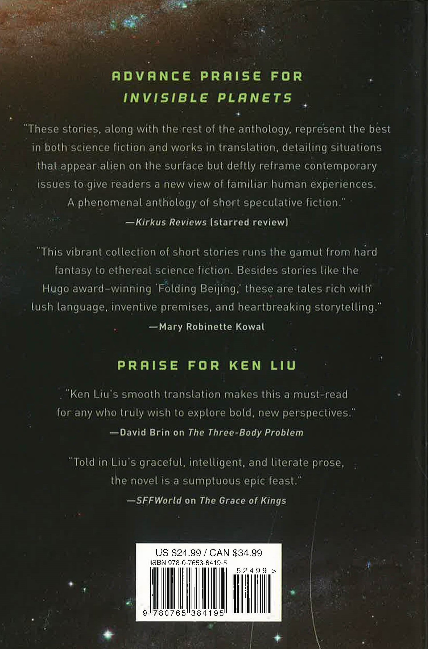 Invisible Planets, edited by multi award-winning writer Ken Liu--translator of the bestselling and Hugo Award-winning novel The Three Body Problem by acclaimed Chinese author Cixin Liu--is his second thought-provoking anthology of Chinese short speculative fiction. Invisible Planets is a groundbreaking anthology of Chinese short speculative fiction. The thirteen stories in this collection, including two by Cixin Liu and the Hugo and Sturgeon award-nominated “Folding Beijing” by Hao Jingfang, add up to a strong and diverse representation of Chinese SF. Some have won awards, some have garnered serioius critical acclaim, some have been selected for Year’s Best anthologies, and some are simply Ken Liu’s personal favorites.