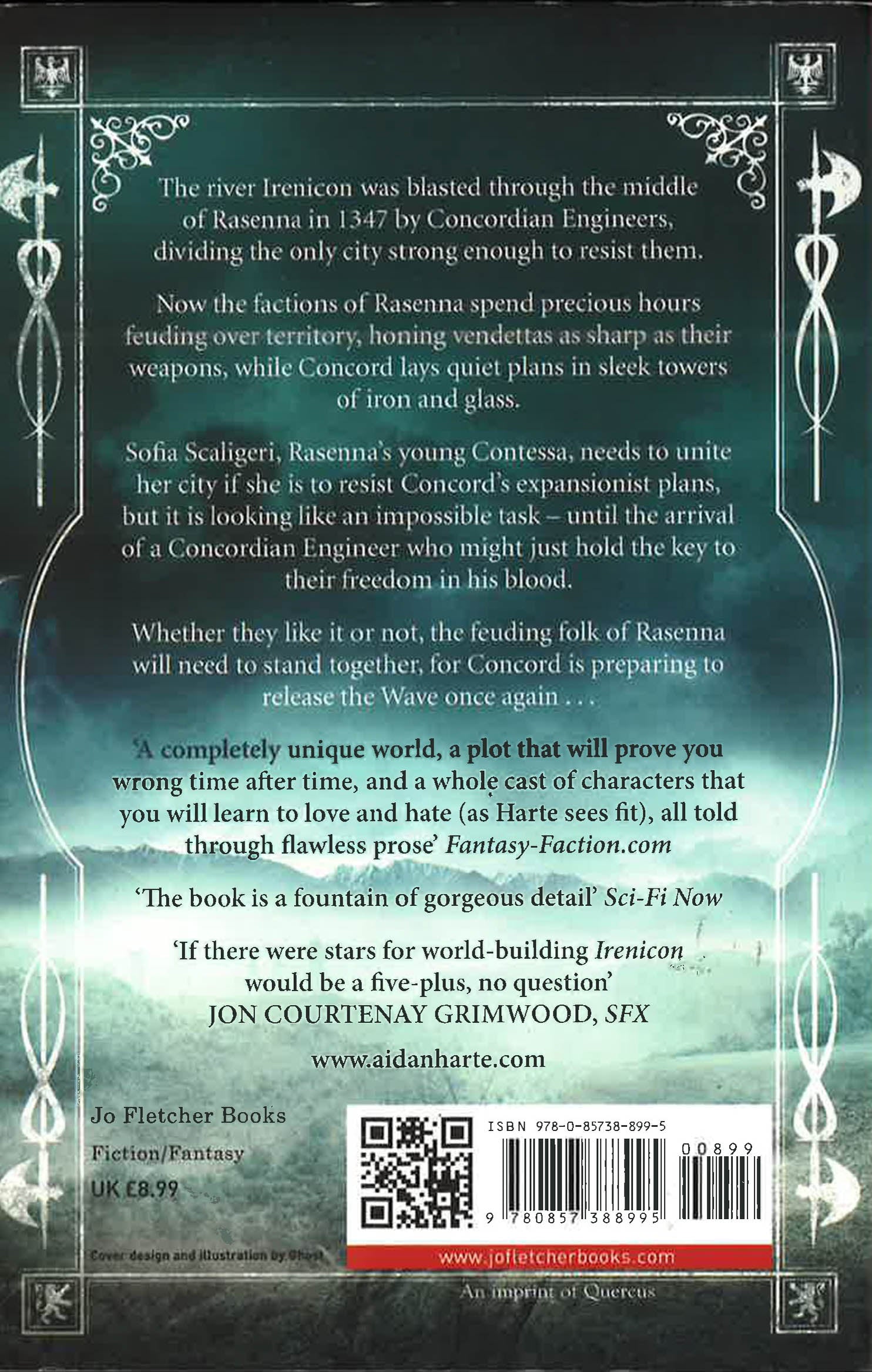 Irenicon is completely fascinating' - Thinking About BooksThe river Irenicon is a feat of Concordian engineering. Blasted through the middle of Rasenna in 1347 using Wave technology, it divided the only city strong enough to defeat the Concordian Empire. But no one could have predicted it would become sentient, and hostile. Sofia Scaligeri, the soon-to-be Contessa of Rasenna, is inheriting a city tearing itself apart from the inside. She can see no way of stopping Rasenna's culture of vendetta . . . until a Concordian engineer arrives to build a bridge over the Irenicon. He shows her that the feuding factions of Rasenna can continue to fight each other, or they can unite against Concord. And they will need to stand together - for Concord is about to unleash the Wave again . . .Set in a darkly original alternative Renaissance Italy, Irenicon is a gripping adventure, a tragic love story and a very modern tale of redemption.
