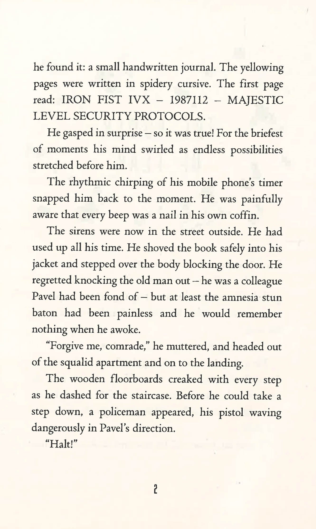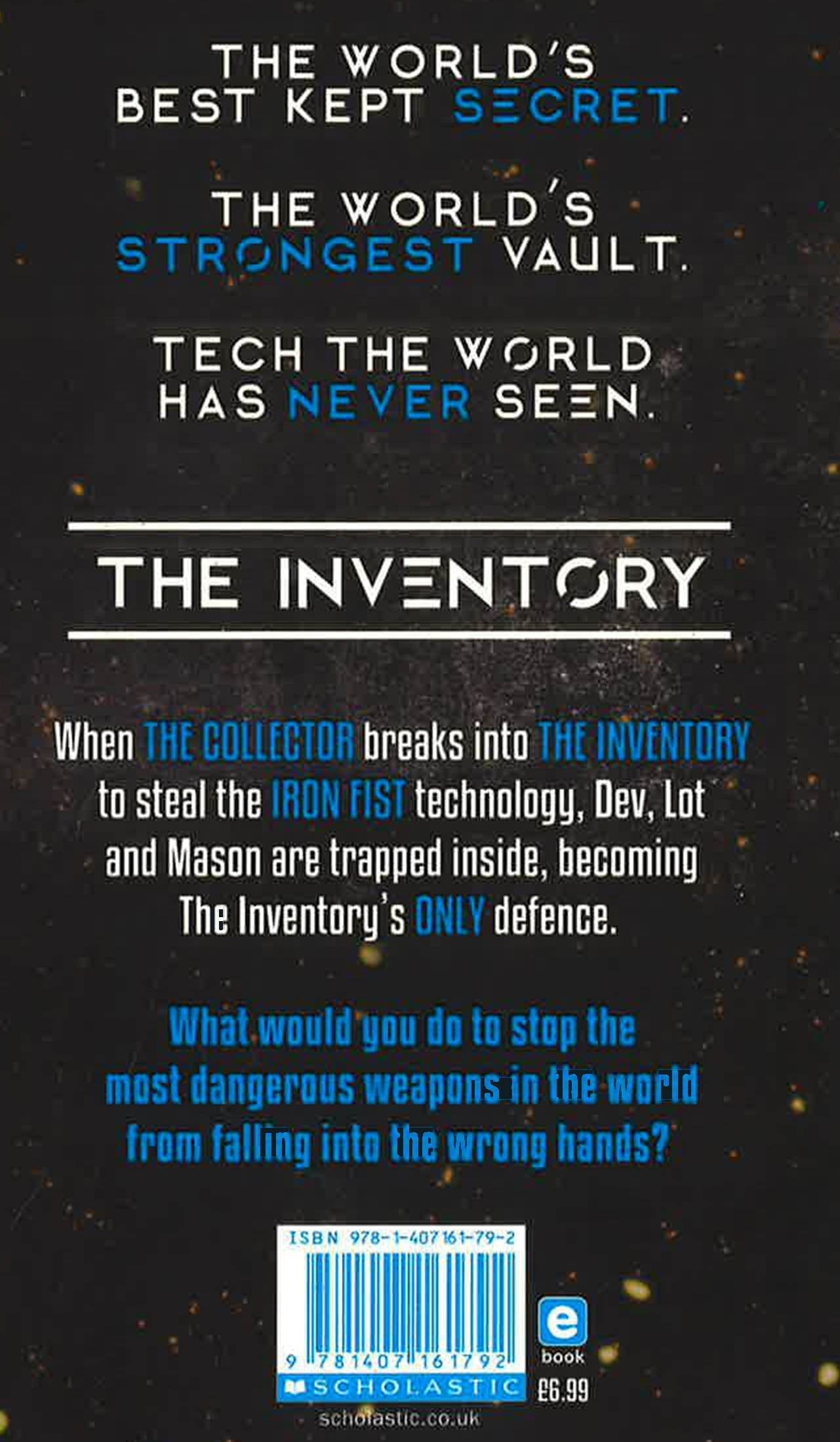 The first book in the action-packed Inventory series. Hidden under a small suburban town, the Inventory is a collection of the most incredible technology the world has NEVER seen: invisible camouflage, HoverBoots, indestructible metals, and the deadly war robot Iron FistDev's uncle, Charlie Parker, is the Inventory's mild-mannered curator, with security provided by Eema, a beyond-state-of-the-art artificial intelligence system. But security is catastrophically breached when Lot and Mason from school turn up unexpectedly and, hot on their heels, a ruthless gang of thieves working for the Collector and the Shadow Helix organisation.If the thieves succeed in their goal to seize the Iron Fist, Dev, his friends, and the world are in a whole heap of trouble. THE INVENTORY SERIES OF BOOKS Iron Fist (book 1) Gravity (book 2) Black Knight (book 3) Winter Storm (book 4)