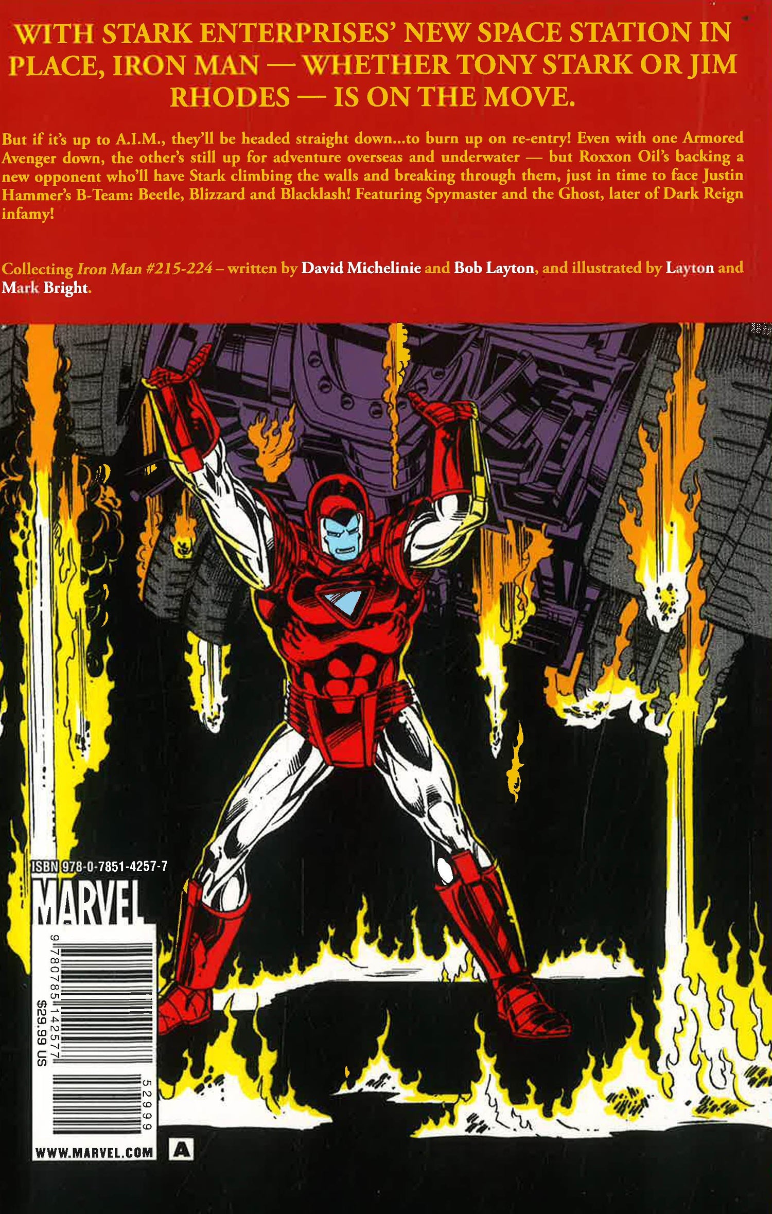 With Stark Enterprises' new space station in place, Iron Man - whether Tony Stark or Jim Rhodes - is on the move. But if it's up to AIM, they'll be headed straight down...to burn up on re-entry! Even with one Armored Avenger down, the other's still up for adventure overseas and underwater - but Roxxon Oil's backing a new opponent who'll have Stark climbing the walls and breaking through them, just in time to face Justin Hammer's B-Team: Beetle, Blizzard, and Blacklash! Featuring Spymaster and the Ghost, later of Dark Reign infamy! Collects Iron Man (1968) #215-224.