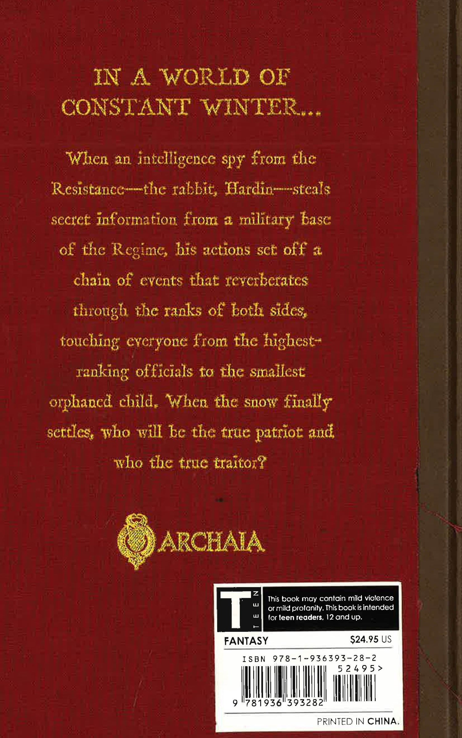 It is the aftermath of a long war, in a world of constant winter. An intelligence spy from the Resistance the rabbit, Hardin steals secret information from a military base of the Regime. His actions set off a chain of events that reverberates through the ranks of both sides, touching everyone from Pavel the crow to Giles the goat, from the highest-ranking officials to the smallest orphaned child. When the snow finally settles, who will be the true patriot and who the true traitor?