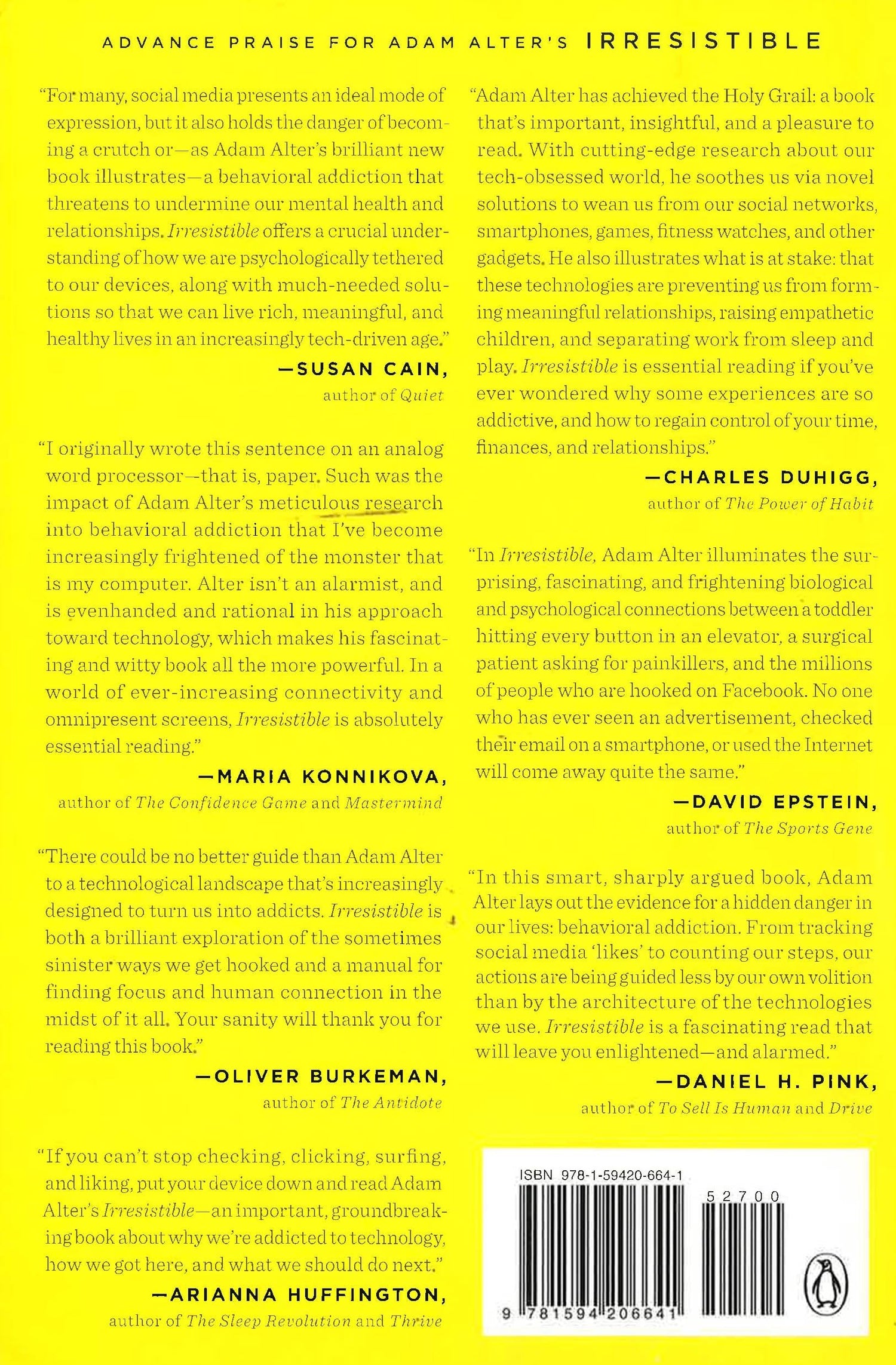 Welcome to the age of behavioral addiction--an age in which half of the American population is addicted to at least one behavior. We obsess over our emails, Instagram likes, and Facebook feeds; we binge on TV episodes and YouTube videos; we work longer hours each year; and we spend an average of three hours each day using our smartphones. Half of us would rather suffer a broken bone than a broken phone, and Millennial kids spend so much time in front of screens that they struggle to interact with real, live humans. In this revolutionary book, Adam Alter, a professor of psychology and marketing at NYU, tracks the rise of behavioral addiction, and explains why so many of today's products are irresistible. Though these miraculous products melt the miles that separate people across the globe, their extraordinary and sometimes damaging magnetism is no accident. The companies that design these products tweak them over time until they become almost impossible to resist. By reverse engineering behavioral addiction, Alter explains how we can harness addictive products for the good--to improve how we communicate with each other, spend and save our money, and set boundaries between work and play--and how we can mitigate their most damaging effects on our well-being, and the health and happiness of our children.