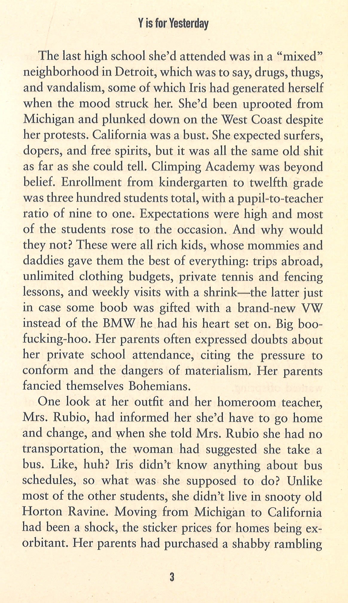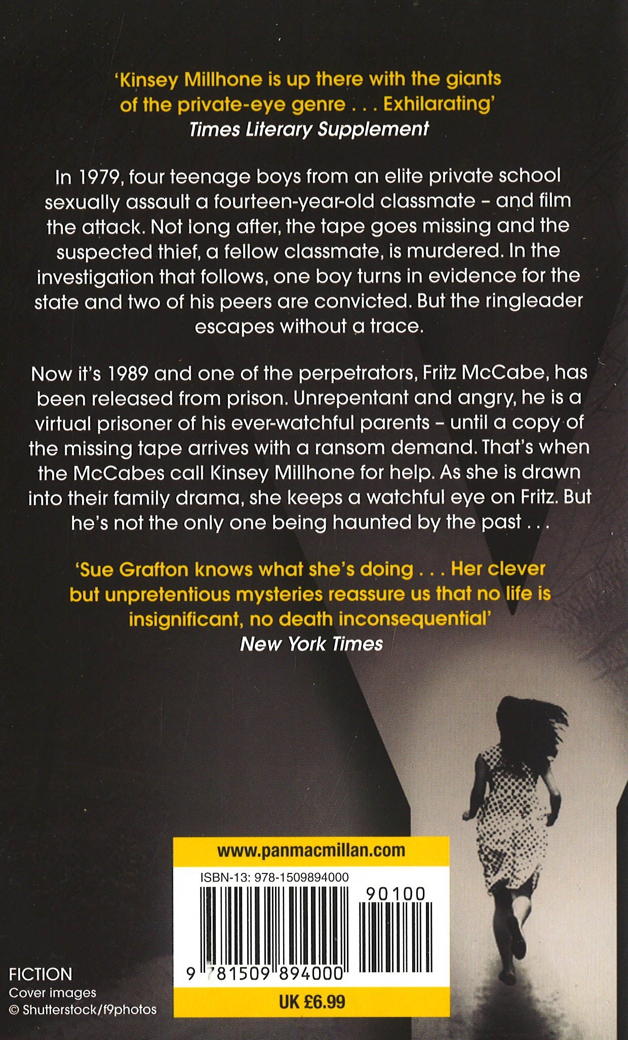 The alphabet mysteries continue with a harrowing case for private investigator Kinsey Millhone.Y is for Yesterday is the twenty-fifth in the Kinsey Millhone mystery series by Sue Grafton.The darkest and most disturbing case report from the files of Kinsey Millhone, Y is for Yesterday begins in 1979, when four teenage boys from an elite private school sexually assault a fourteen-year-old classmate - and film the attack. Not long after, the tape goes missing and the suspected thief, a fellow classmate, is murdered. In the investigation that follows, one boy turns in evidence for the state and two of his peers are convicted. But the ringleader escapes without a trace.Now, it's 1989 and one of the perpetrators, Fritz McCabe, has been released from prison. Moody, unrepentant, and angry, he is a virtual prisoner of his ever-watchful parents - until a copy of the missing tape arrives with a ransom demand. That's when the McCabes call Kinsey Millhone for help. As she is drawn into their family drama, she keeps a watchful eye on Fritz. But he's not the only one being haunted by the past. A vicious sociopath with a grudge against Millhone may be leaving traces of himself for her to find . . .
