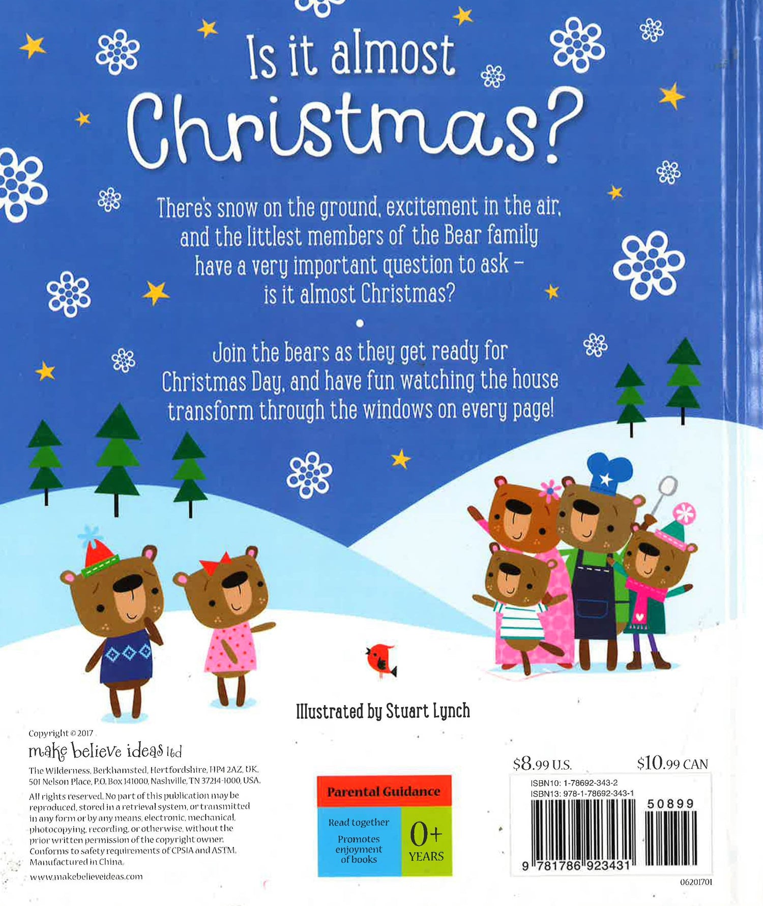 A magical Christmas book sure to delight children and adults alike! Introducing Is It Almost Christmas?, which is a delightful new board book following the Bear family as they prepare their house for Christmas. Charming illustrations reveal each room of the bears' house, and as children turn each page, cut-through windows see each room transformed for Christmas Day! (Age Range: 5-9)