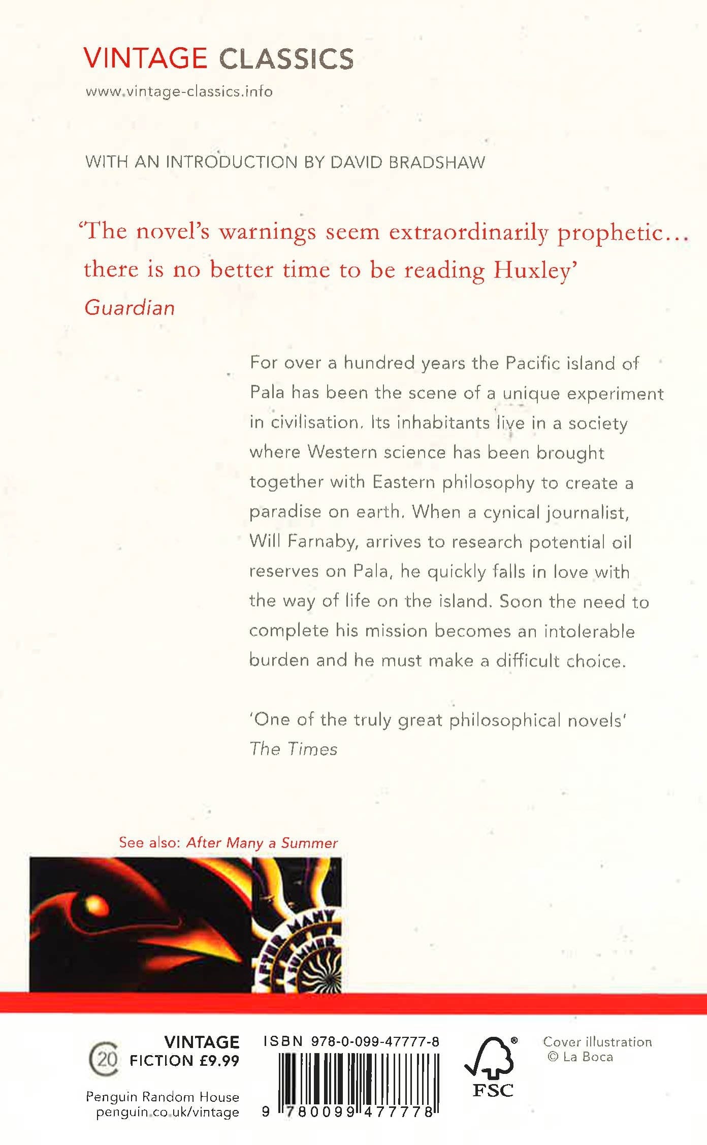 For over a hundred years the Pacific island of Pala has been the scene of a unique experiment in civilisation. Its inhabitants live in a society where western science has been brought together with Eastern philosophy to create a paradise on earth. When cynical journalist, Will Farnaby, arrives to research potential oil reserves on Pala, he quickly falls in love with the way of life on the island. Soon the need to complete his mission becomes an intolerable burden and he must make a difficult choice. In counterpoint to Brave New World and Ape and Essence, in Island Huxley gives us his vision of utopia. WITH A BIOGRAPHICAL INTRODUCTION BY DAVID BRADSHAW
