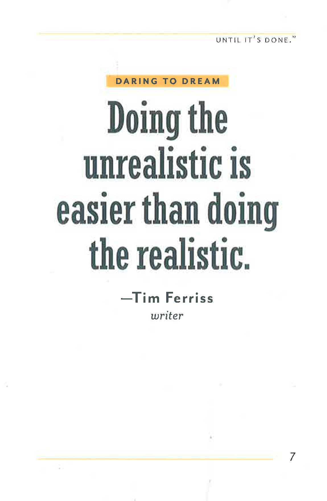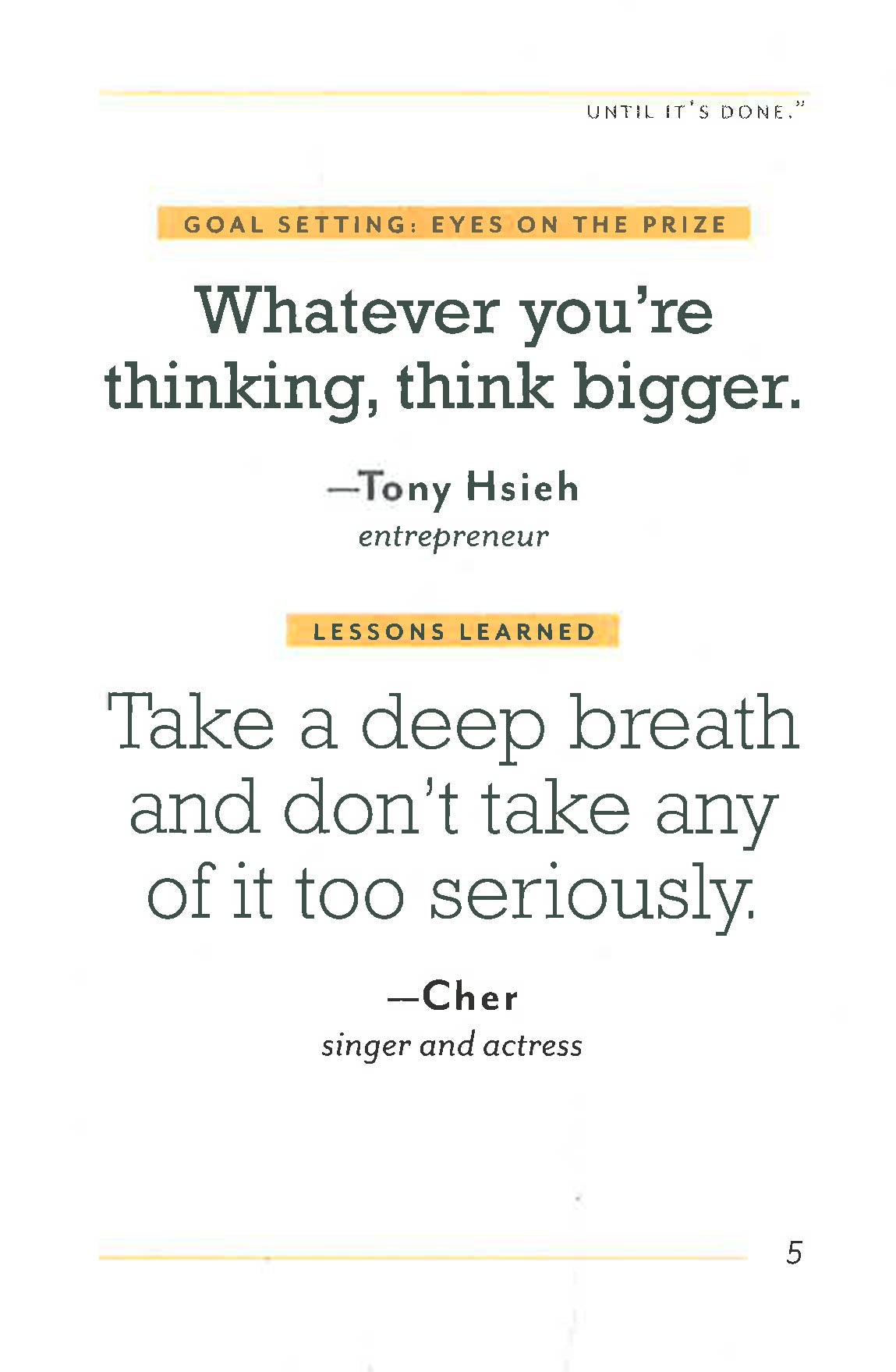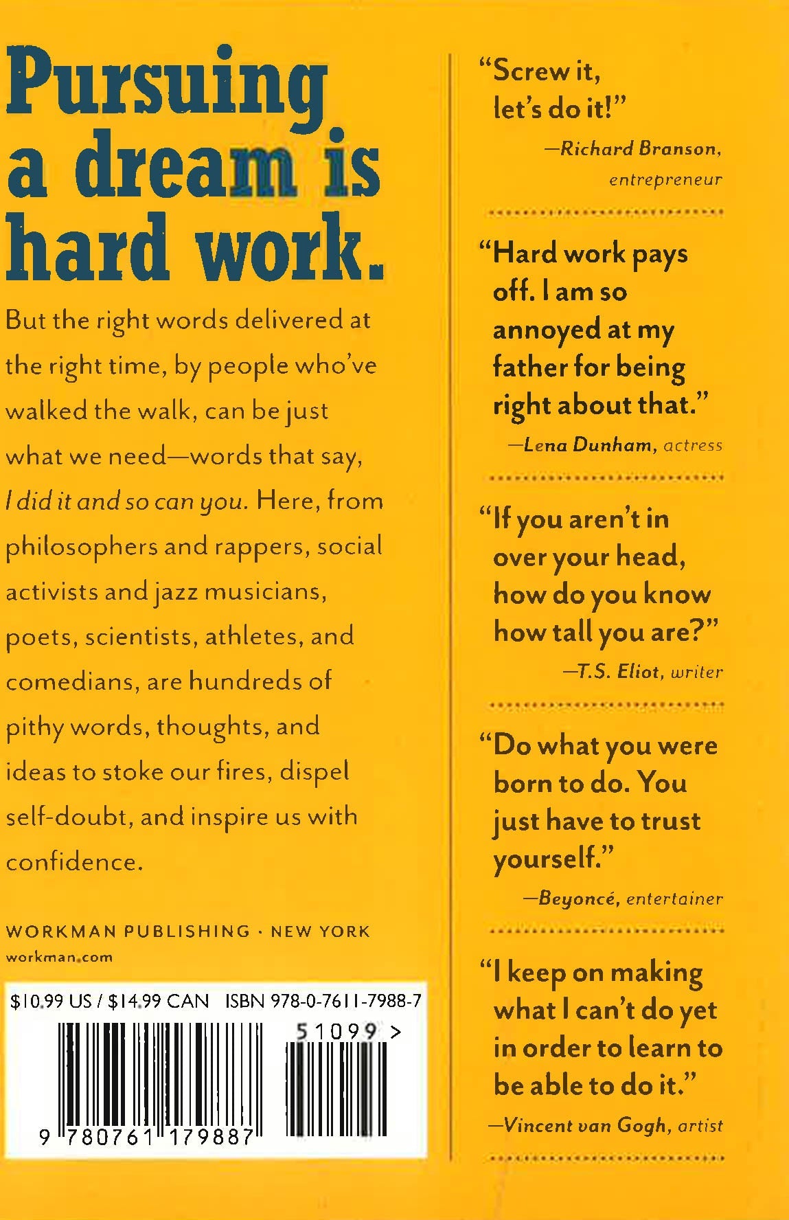 Pursuing a dream is hard work. But the right words delivered at the right time, by people who've walked the walk, can be just what we need - words that say, "I did it and so can you." Here, from philosophers and rappers, social activists and jazz musicians, poets, scientists, athletes, and comedians, are hundreds of pithy words, thoughts, and ideas to stoke our fires, dispel self-doubt, and inspire us with confidence.