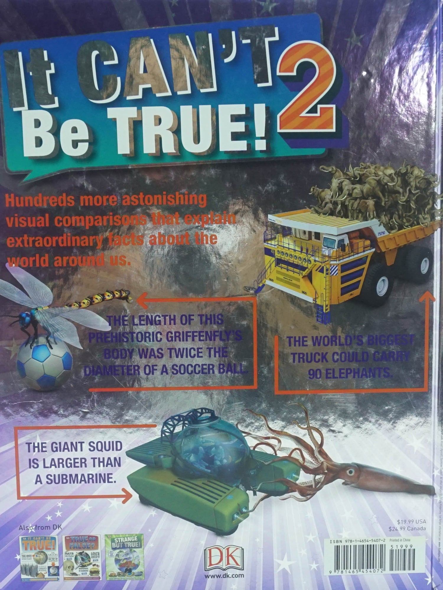 How many bees does it take to make a jar of honey? Did you know sharks are so sensitive that they can detect the current from batteries 1,000 miles apart? Believe it or not, it's true. Discover more amazing and seemingly impossible facts in It Can't Be True! 2. By combining hard to believe facts with CGI renderings and photographs, this book places information with visual aids that puts everything to scale, including how the Titanic would be in the shadow of today's huge ocean liners. Kids will love the weird, out-of-this-world facts for just about anything. See how big a squid can grow compared to people, figure out how much water an elephant can hold in its trunk, and look at how a tiny frog can fit on a coin. Readers will pore over the pages of this book to find astounding facts in this new collection. It Can't Be True! 2 uses photography, infographics, and snappy text to bring facts to life that will have kids eager to find out more bizarre facts to share with family and friends.