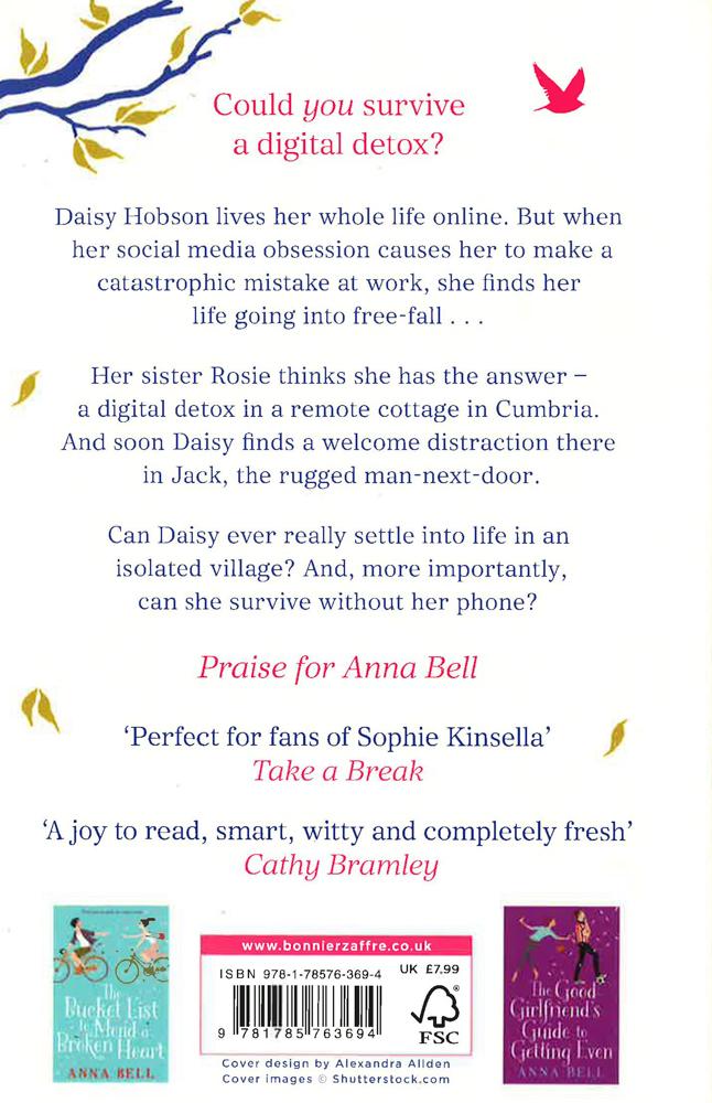 See what people are already saying about the queen of romantic comedy, Anna Bell:'Romantic and refreshing' Mhairi McFarlane'A fun, bouncy, brilliant tale' Heat'Funny, relatable and fabulously written' Daily Express'Perfect for fans of Sophie Kinsella' Take a Break Could you survive a digital detox? This hilarious new romantic comedy from the author of The Bucket List to Mend a Broken Heart, is perfect for fans of Lucy Diamond and Sophie Kinsella. Daisy Hobson lives her whole life online. A marketing manager by day, she tweets her friends, instagrams every meal and arranges (frankly, appalling) dates on Tinder. But when her social media obsession causes her to make a catastrophic mistake at work, Daisy finds her life going into free-fall . . . Her sister Rosie thinks she has the answer to all of Daisy's problems - a digital detox in a remote cottage in Cumbria, that she just happens to need help doing up. Soon, too, Daisy finds herself with two welcome distractions: sexy French exchange-help Jean-Marie, and Jack, the brusque and rugged man-next-door, who keeps accidentally rescuing her. But can Daisy, a London girl, ever really settle into life in a tiny, isolated village? And, more importantly, can she survive without her phone? See what people are already saying about the queen of romantic comedy, Anna Bell: 'Romantic and refreshing' Mhairi McFarlane 'A fun, bouncy, brilliant tale' Heat 'Funny, relatable and fabulously written' Daily Express 'Perfect for fans of Sophie Kinsella' Take a Break