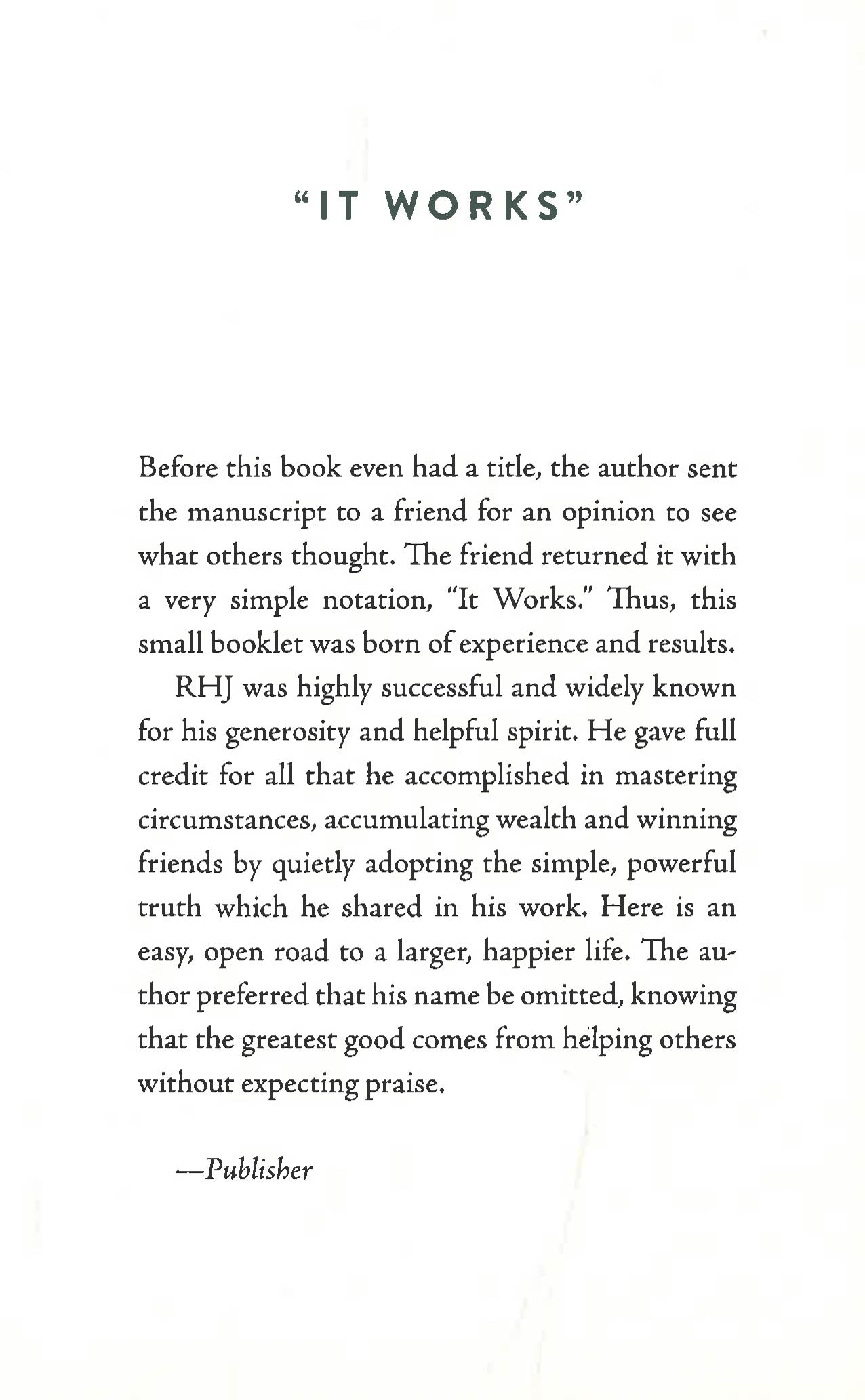 It Works is a life-changing plan for achieving your deepest held ambitions and your loftiest dreams. Since it was first published in 1926, this slender volume has sold millions of copies and changed just as many lives. With three short rules and a concrete plan of action, It Works is a compact, practical guide to change, in every area of your life. R.H. Jarrett’s landmark guide to change can help you find motivation and achieve growth in your life. Read this book and discover for yourself what the title has already told you - it truly does work! This brand-new edition includes the complete original text as well as a powerful bonus book.