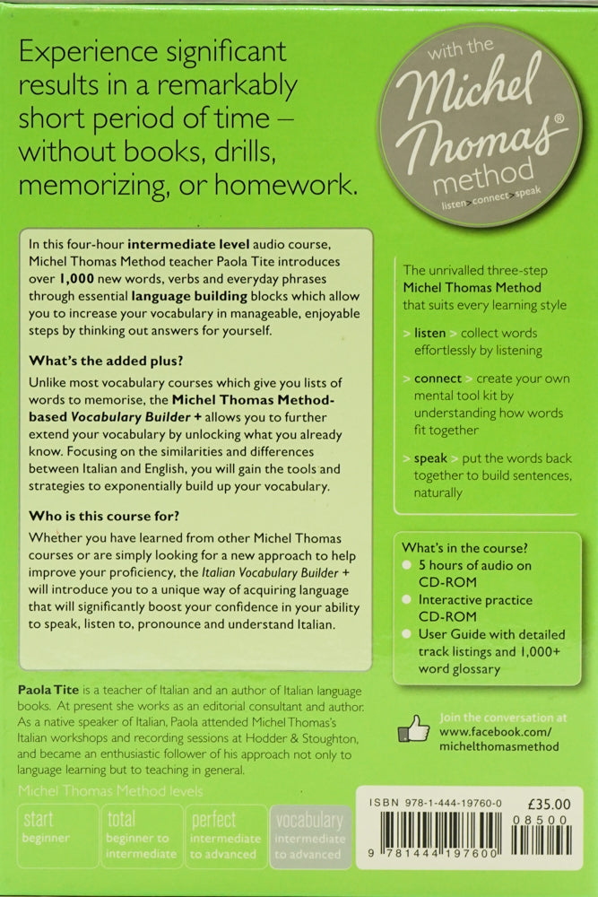 Experience significant results in a remarkably short period of time - without books, drills, memorizing, or homework. In this five-hour intermediate level audio course Michel Thomas Method teacher Paola Tite introduce over 1,000 new words, verbs and everyday phrases through essential language building blocks which allow you to increase your vocabulary in manageable, enjoyable steps by thinking out answers for yourself. What's the added plus? Unlike most vocabulary courses which give you lists of words to memorise, the Michel Thomas Method-based Vocabulary Builder+ allows you to further extend your vocabulary by unlocking what you already know. Focusing on the similarities and differences between Italian and English, you will gain the tools and strategies to exponentially build up your vocabulary. Who is this course for? Whether you have learned from other Michel Thomas courses or are simply looking for a new approach to help improve your proficiency, the Italian Vocabulary Builder+ will introduce you to a unique way of acquiring language that will significantly boost your confidence in your ability to speak, listen to, pronounce and understand Italian.