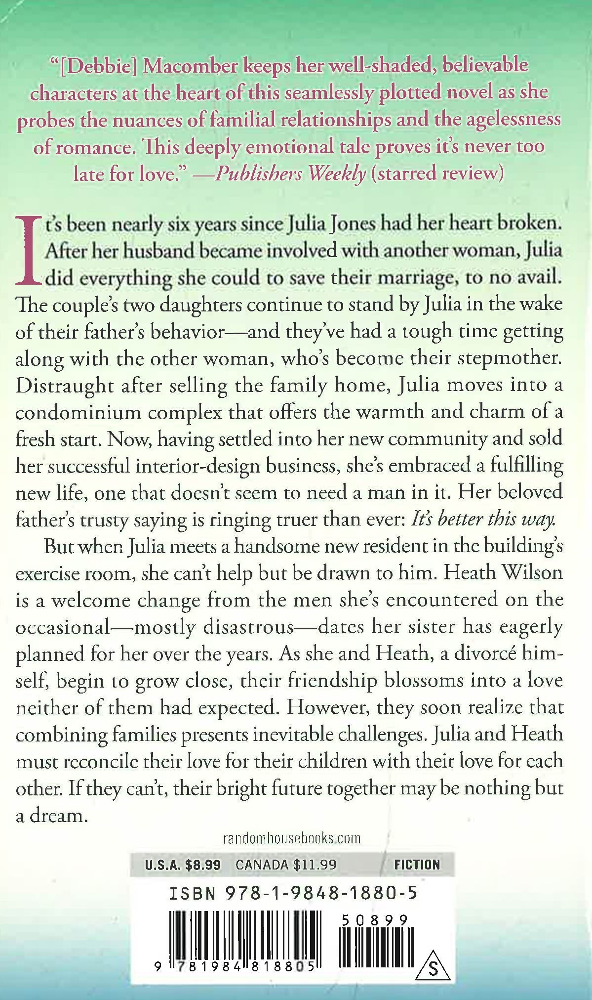 But when Julia meets a handsome new resident in the building’s exercise room, she can’t help but be drawn to him. Heath Wilson is a welcome change from the men she’s encountered on the occasional—mostly disastrous—dates her sister has eagerly planned for her over the years. As she and Heath, a divorcé himself, begin to grow close, their friendship blossoms into an unexpected love. However, they soon realize that combining families proves to be a challenge, even though their four children are adults.