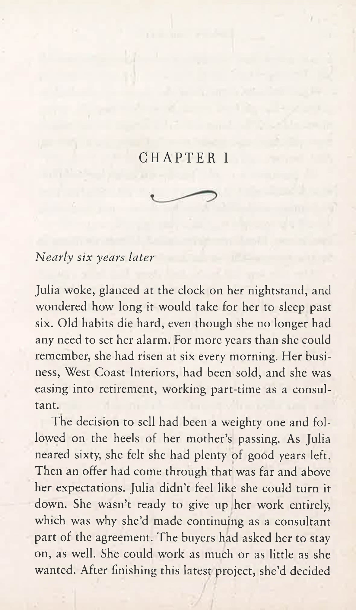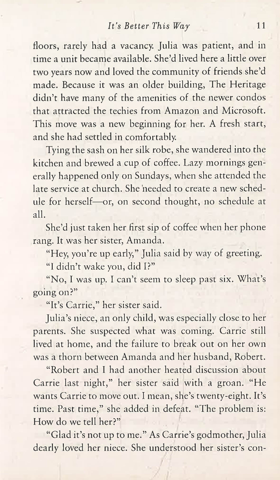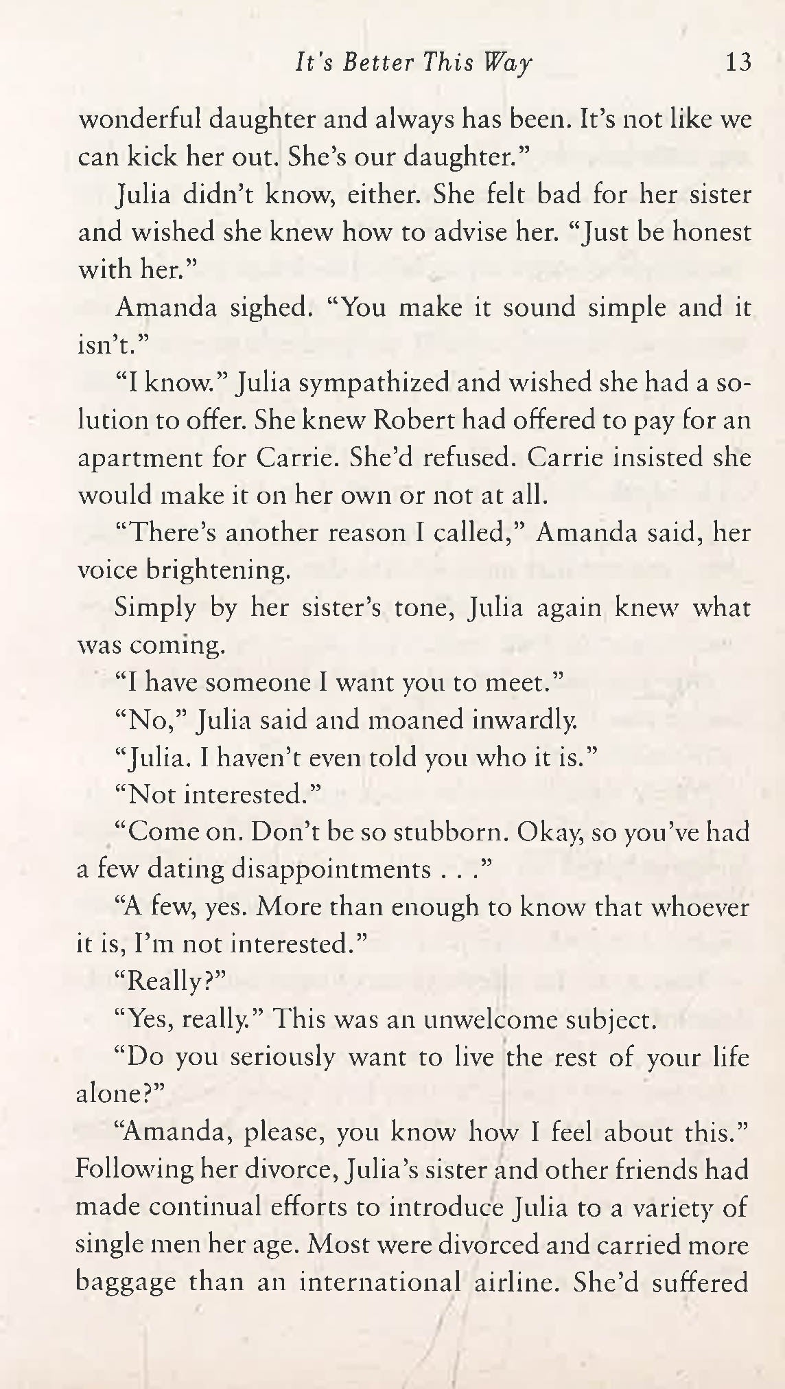 It’s been nearly six years since Julia Jones had her heart broken. After her husband became involved with another woman, she did everything she could to save their marriage, to no avail. The couple’s two daughters continue to stand by Julia in the wake of their father’s behavior—and they’ve had a tough time getting along with the other woman who’s become their stepmother. Distraught after selling the family home, Julia moves into a condominium complex that offers the warmth and charm of a fresh start. Now, having settled into her new community and sold her successful interior design business, she’s embraced a fulfilling new life, one that doesn’t seem to need a man in it. Her beloved father’s trusty saying is ringing truer than ever: It’s better this way.