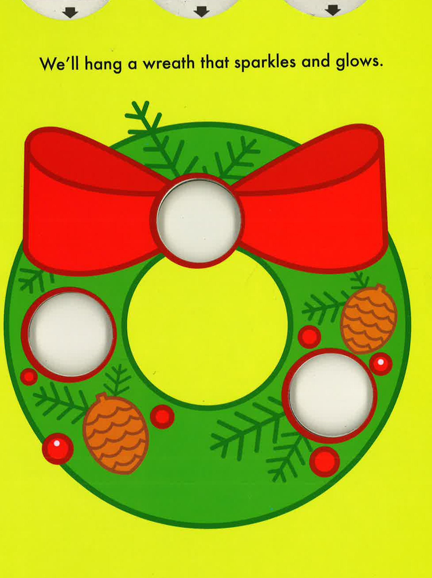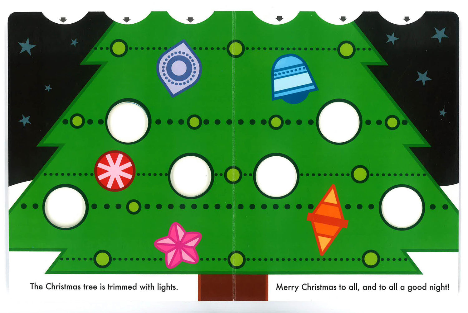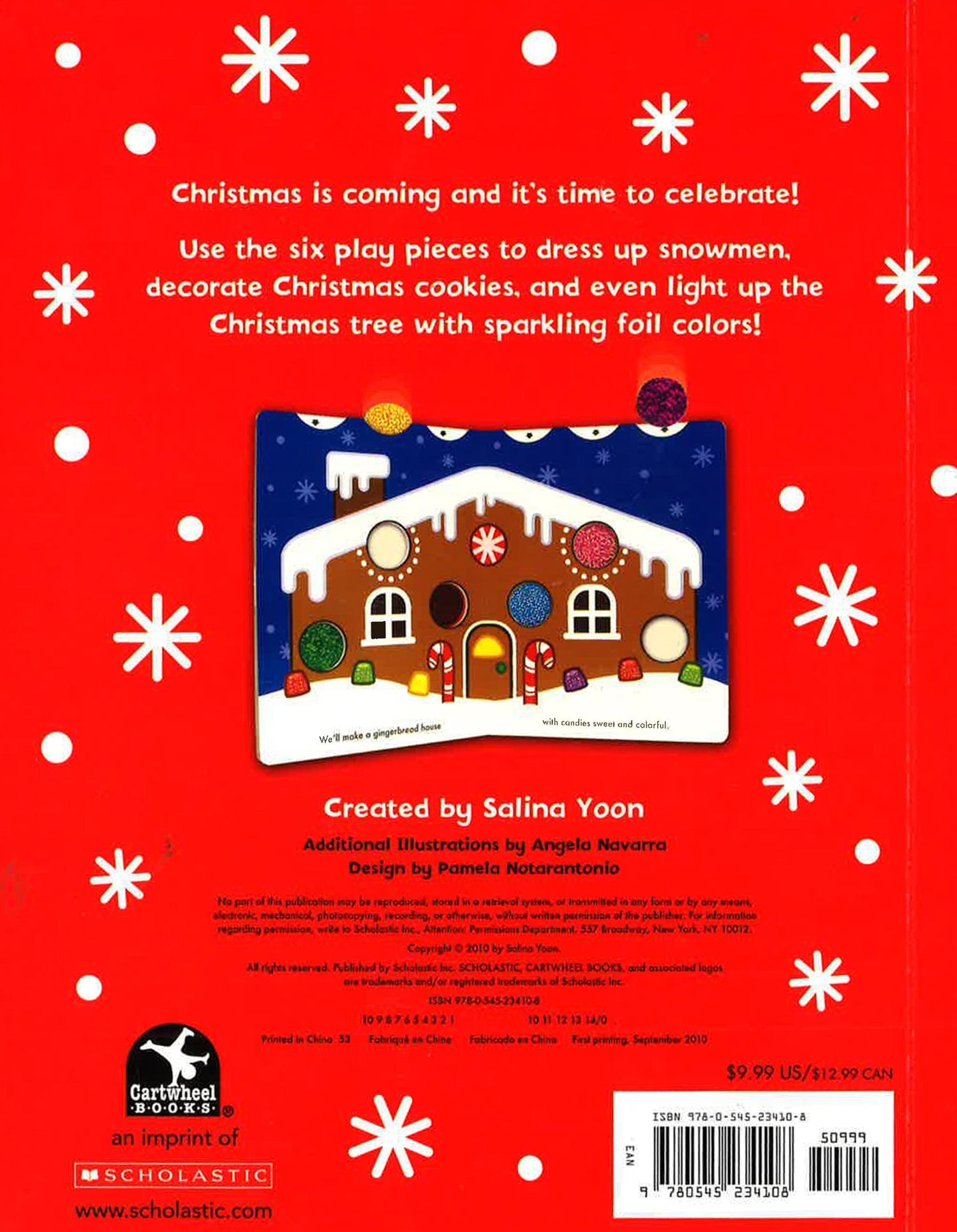 A dazzling Christmas novelty book with foiled, die-cut disks that slip and slide their way through the holiday lights! Christmas is coming and it's time to celebrate! With six interchangable, foiled play pieces, children can dress-up snowmen, decorate Christmas cookies, and even light up the Christmas tree with sparkling foil colors! Housed in a front panel drawer within the cover, these six disks are placed into die-cut slots on each spread to introduce bright lights and joyous excitement to iconic holiday scenes.