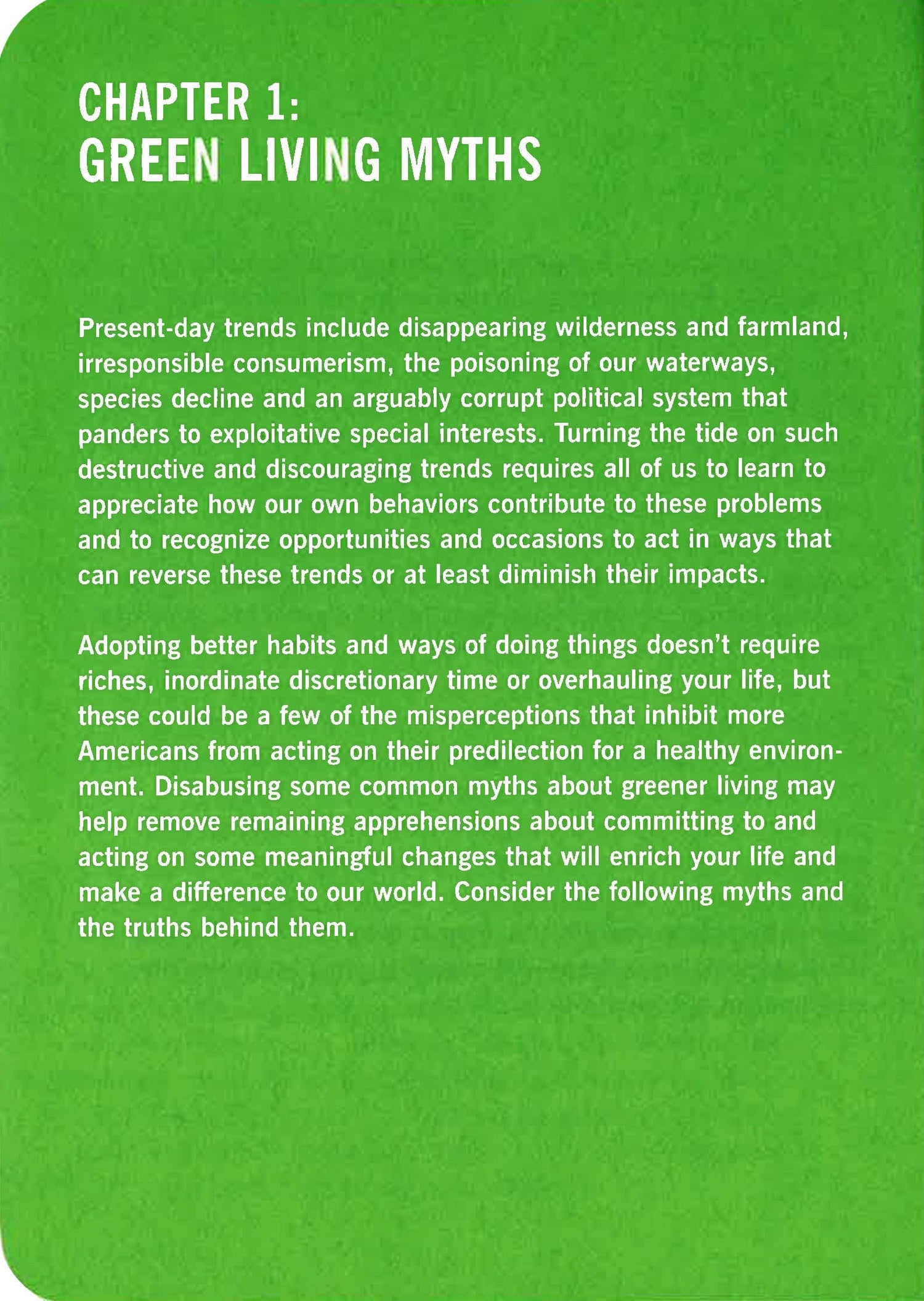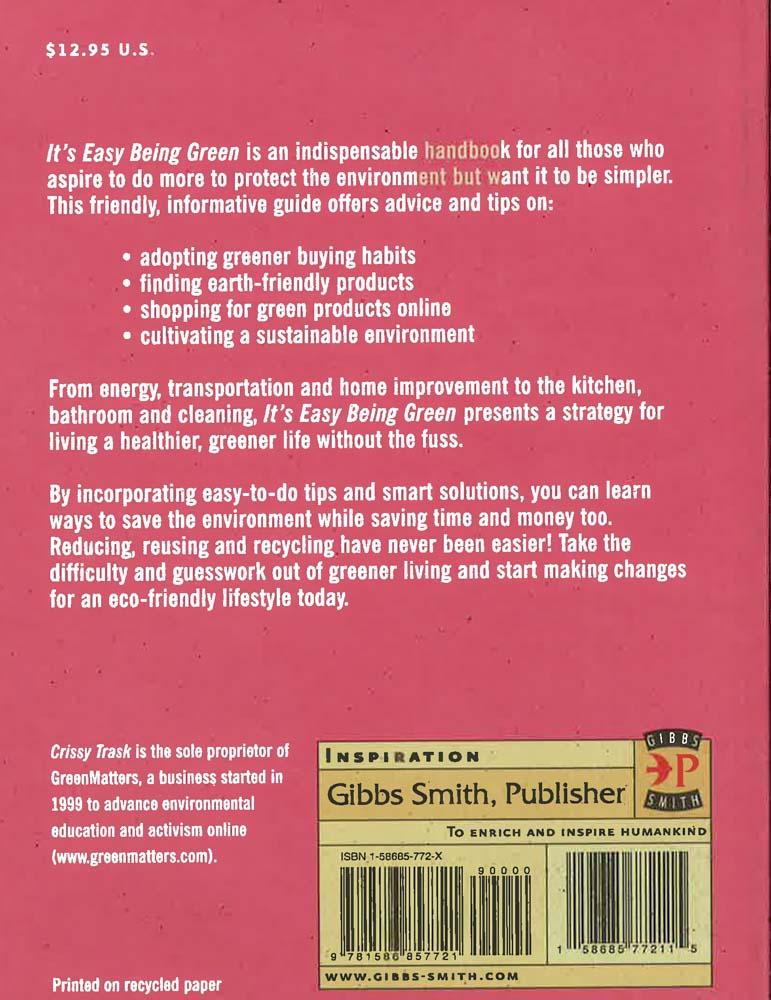 Surveys find that over 80 percent of Americans agree with the goals of the environmental movement. Sadly, most Americans admit to doing little more than basic recycling when it comes to acting on that disposition. What is the reason for this great divide between environmental sentiment in this country and individual actions? Author and environmental consultant Crissy Trask seeks to answer this question-and solve the disparity-with a new book that makes it easy to be an environmentalist, no matter how busy or hectic your lifestyle. This is a day to day guide with simple, practical suggestions that anyone can put into action, like:
