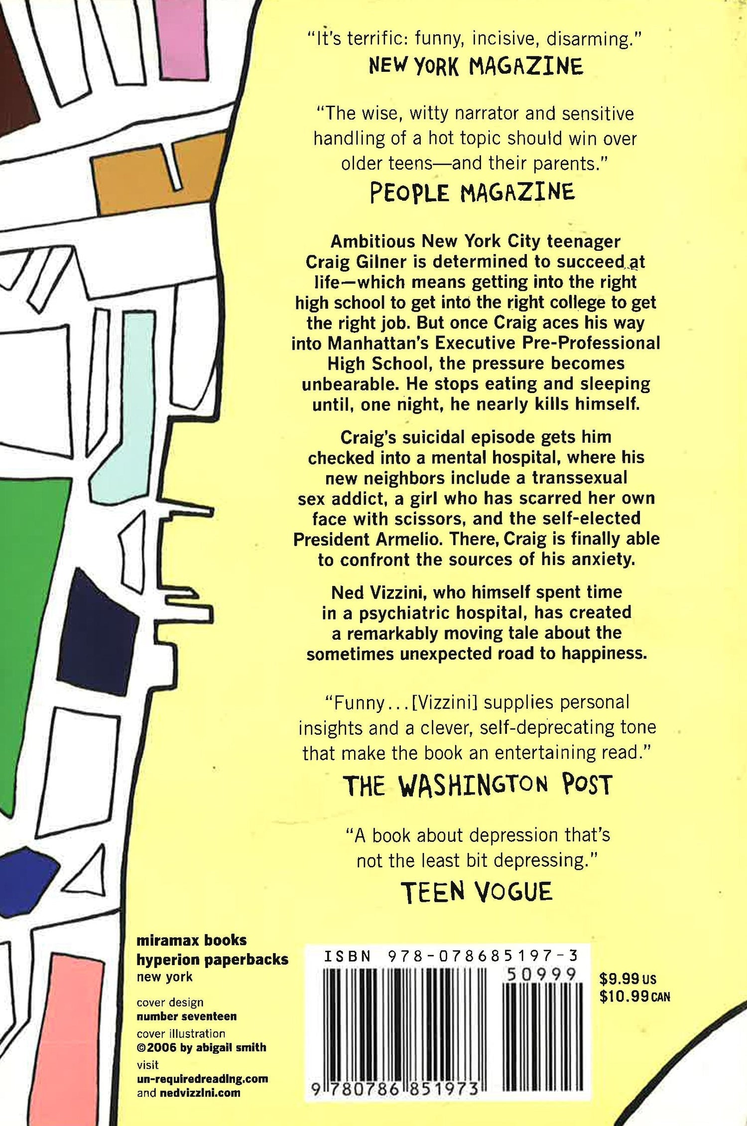 Like many ambitious New York City teenagers, Craig Gilner sees entry into Manhattan's Executive Pre-Professional High School as the ticket to his future. Determined to succeed at life - which means getting into the right high school to get into the right college to get the right job - Craig studies night and day to ace the entrance exam, and does. That's when things start to get crazy. At his new school, Craig realizes that he isn't brilliant compared to the other kids; he's just average, and maybe not even that. He soon sees his once-perfect future crumbling away. The stress becomes unbearable and Craig stops eating and sleeping - until, one night, he nearly kills himself. Craig's suicidal episode gets him checked into a mental hospital, where his new neighbors include a transsexual sex addict, a girl who has scarred her own face with scissors, and the self-elected President Armelio. There, isolated from the crushing pressures of school and friends, Craig is finally able to confront the sources of his anxiety. Ned Vizzini, who himself spent time in a psychiatric hospital, has created a remarkably moving tale about the sometimes unexpected road to happiness. For a novel about depression, it's definitely a funny story.