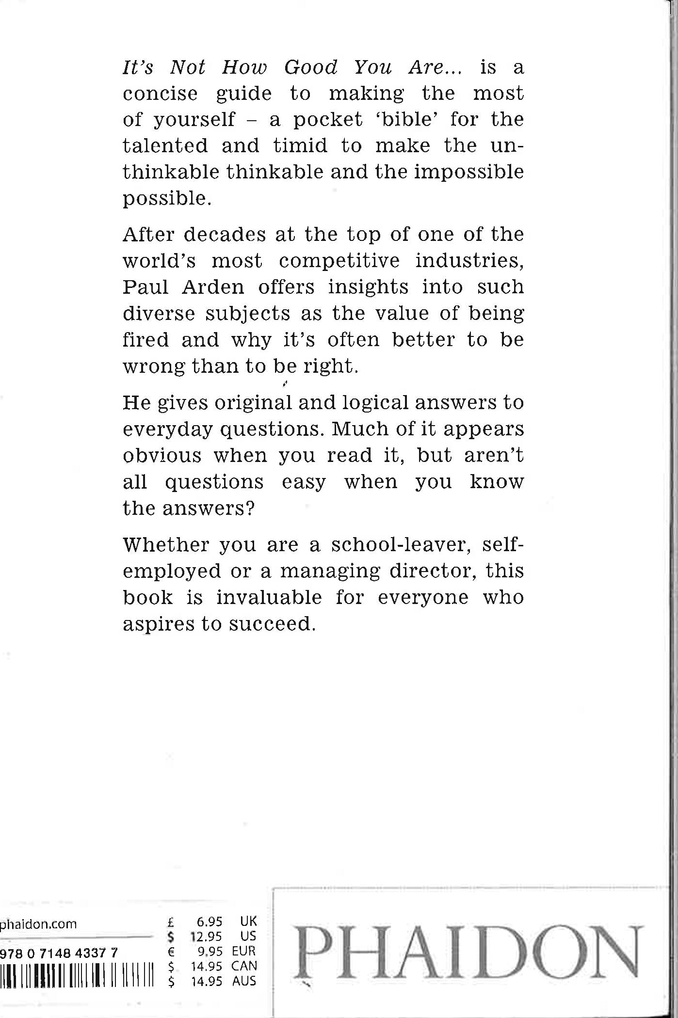 It's Not How Good You Are, It's How Good You Want to Be is a handbook of how to succeed in the world: a pocket bible for the talented and timid alike to help make the unthinkable thinkable and the impossible possible. The world's top advertising guru, Paul Arden, offers up his wisdom on issues as diverse as problem solving, responding to a brief, communicating, playing your cards right, making mistakes, and creativity - all endeavours that can be applied to aspects of modern life. This uplifting and humorous little book provides a unique insight into the world of advertising and is a quirky compilation of quotes, facts, pictures, wit and wisdom - all packed into easy-to-digest, bite-sized spreads. If you want to succeed in life or business, this book is a must. *This book may have remainder mark
