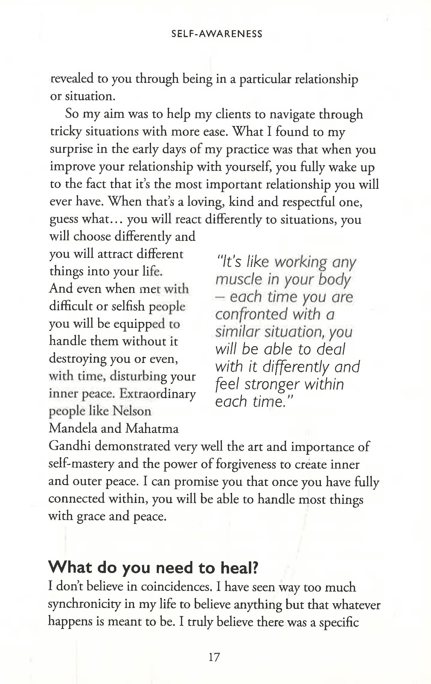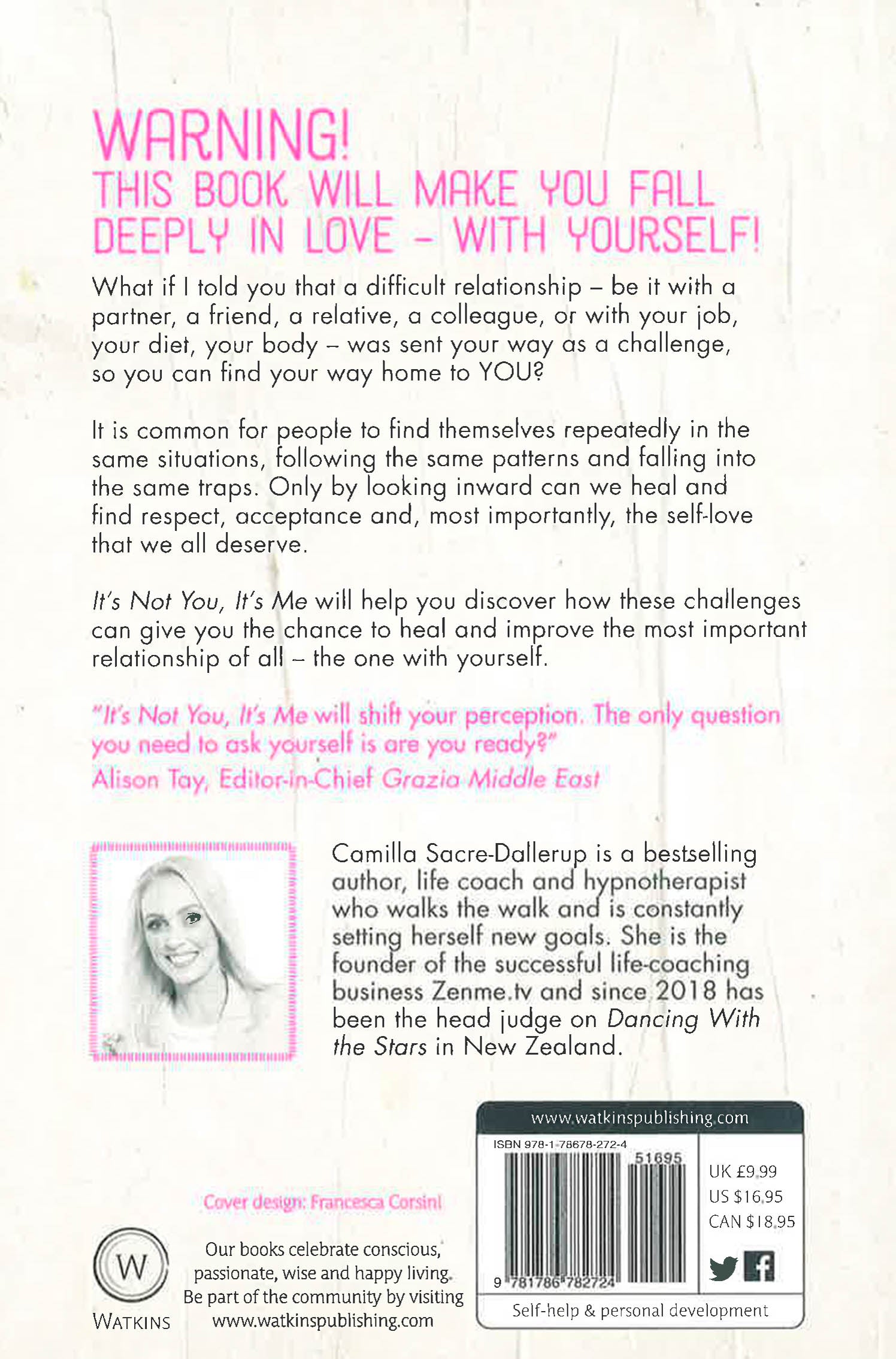 "Camilla has been an absolute saviour for me. With her guidance I've been able to pull through some tough times and put to use the tools she has given me to make sure I don't regress into old habits" Karen Clifton, Professional Dancer All the challenges we face in our lives present us with an opportunity to learn, evolve and grow as people. Holding on to patterns from the past creates blocks; these can make us feel stuck and unworthy of love and respect. In It's Not You, It's Me, Camilla uses a series of targeted questions followed by exercises, tips and techniques to help the reader explore and release their old patterns and blocks so that they can move forward in their lives. Camilla will explore - Self-Awareness Self-Acceptance Self-Love Self-Care This book is a reminder to us all that we are worthy enough and that we do not need to wait for outside validation to feel whole and healed within. By taking responsibility for our situation we can heal the most important relationship – the one we have with ourselves. In doing this, we unlock our true potential and step into our light.