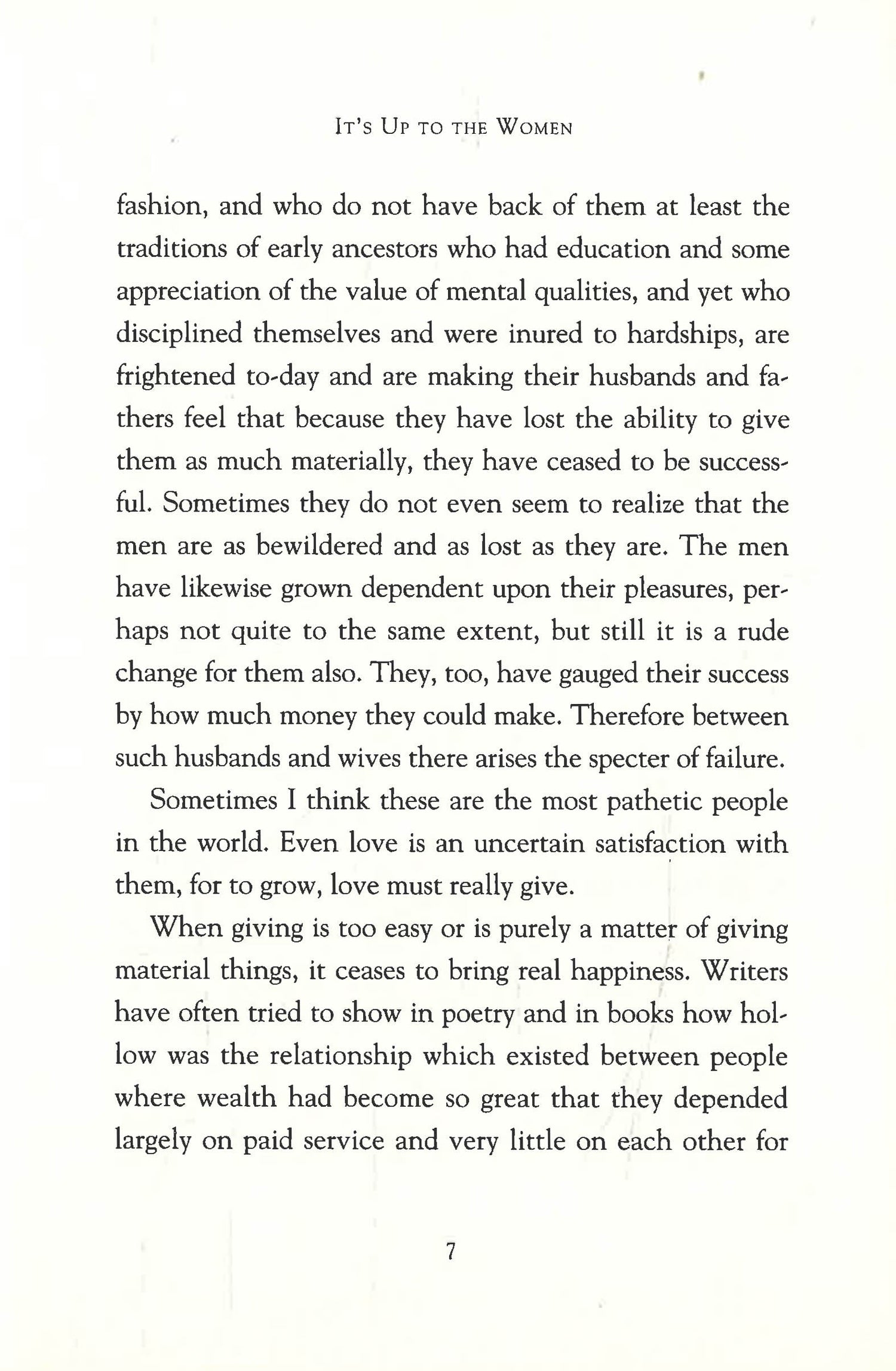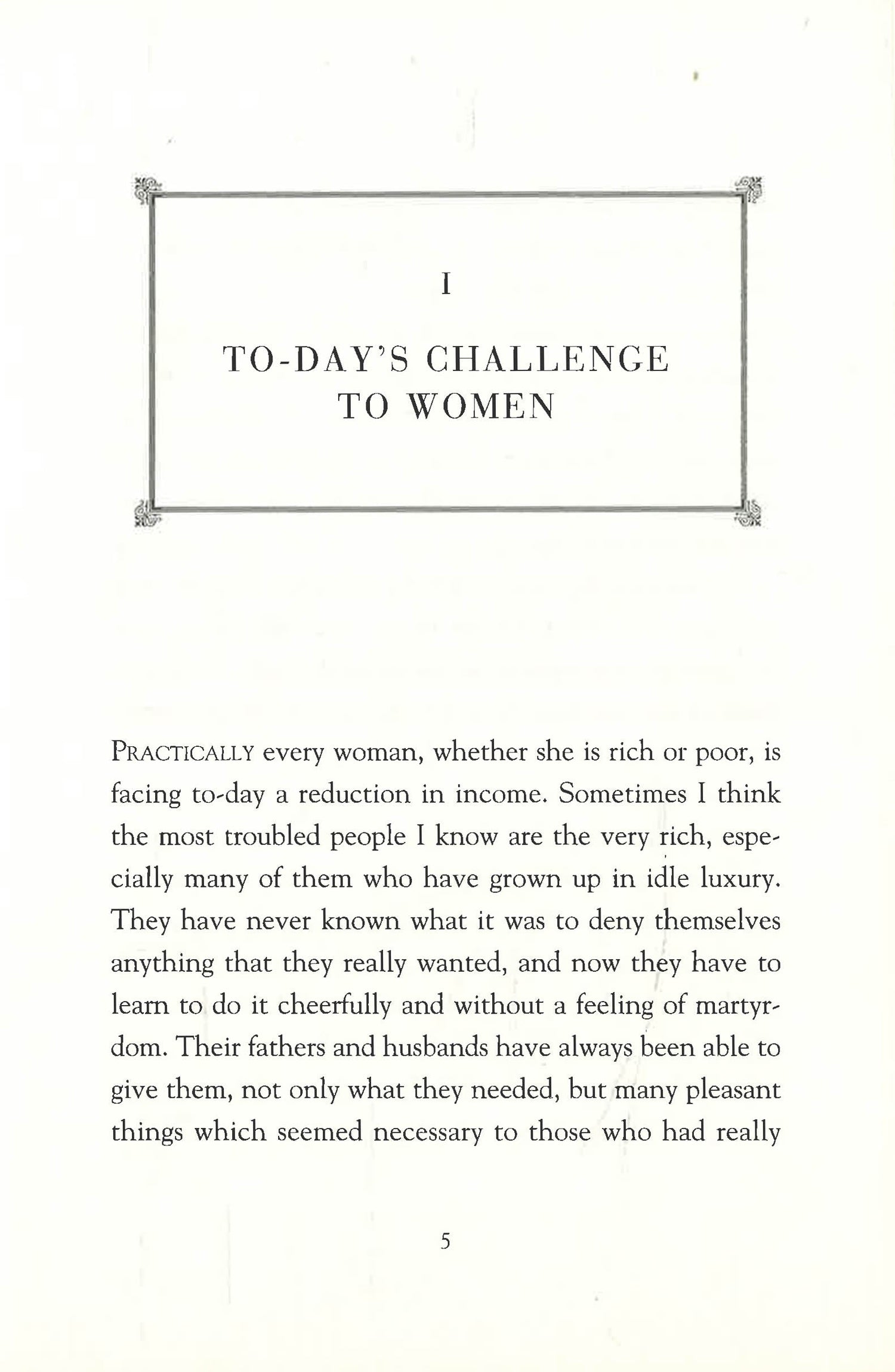 Whether it's the recommendation that working women take time for themselves in order to fully enjoy time spent with their families, recipes for cheap but wholesome home-cooked meals, or America's obligation to women as they take a leading role in the new social order, many of the opinions expressed here are as fresh as if they were written today.