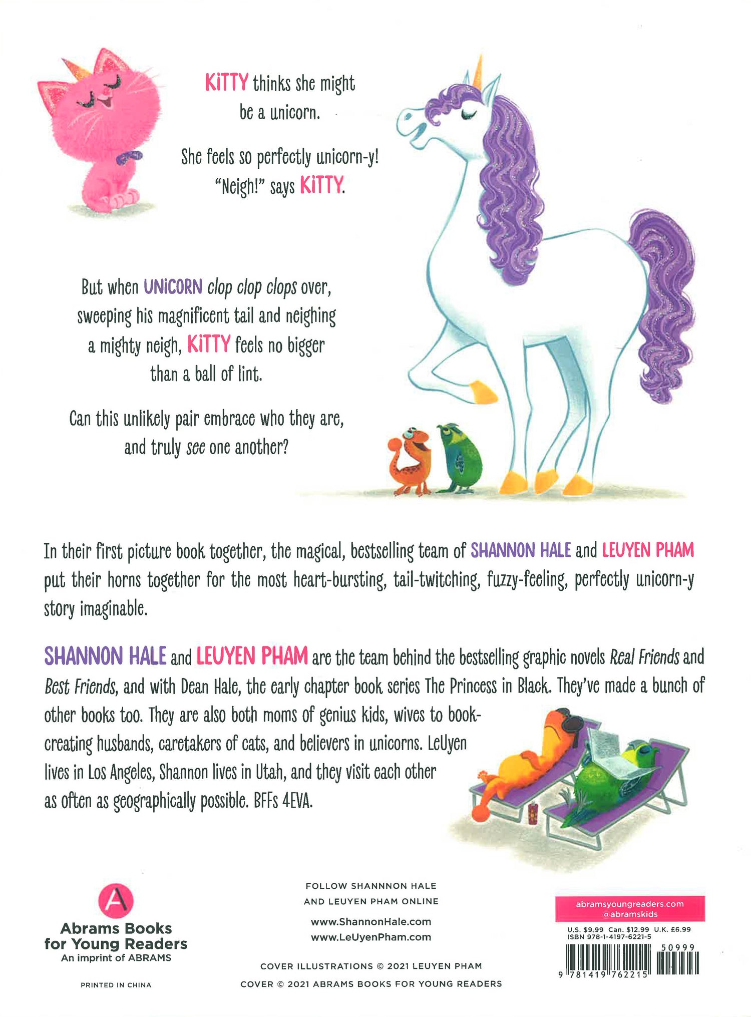 From bestselling superstar duo Shannon Hale and LeUyen Pham comes a delightful kitty and unicorn story that celebrates the magic of friendship―and being exactly who you want to be! Kitty thinks she might be a unicorn. She feels so perfectly unicorn-y! “Neigh!” says Kitty. But when Unicorn clop clop clops over, sweeping his magnificent tail and neighing a mighty neigh, Kitty feels no bigger than a ball of lint. Can this unlikely pair embrace who they are, and truly see one another? In their first picture book together, the magical, bestselling team of Shannon Hale and LeUyen Pham put their horns together for the most heart-bursting, tail-twitching, fuzzy-feeling, perfectly unicorn-y story imaginable.