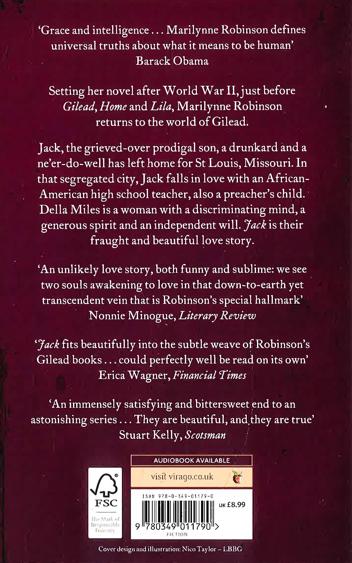 Jack tells the story of John Ames Boughton, the loved and grieved-over prodigal son of a Presbyterian minister in Gilead, Iowa, a drunkard and a ne'er-do-well. In segregated St. Louis sometime after World War II, Jack falls in love with Della Miles, an African-American high school teacher, also a preacher's child, with a discriminating mind, a generous spirit and an independent will. Their fraught, beautiful story is one of Robinson's greatest achievements.