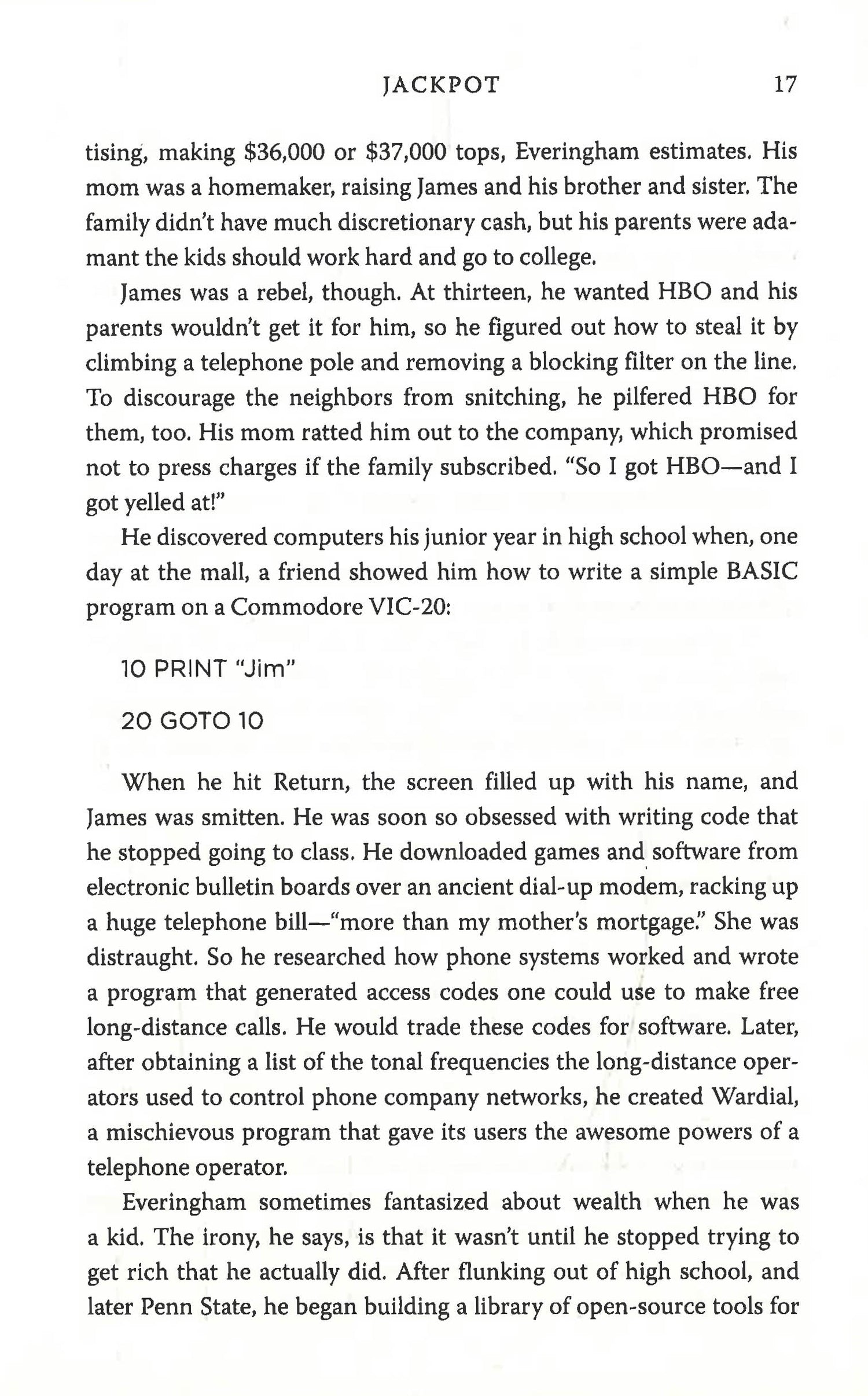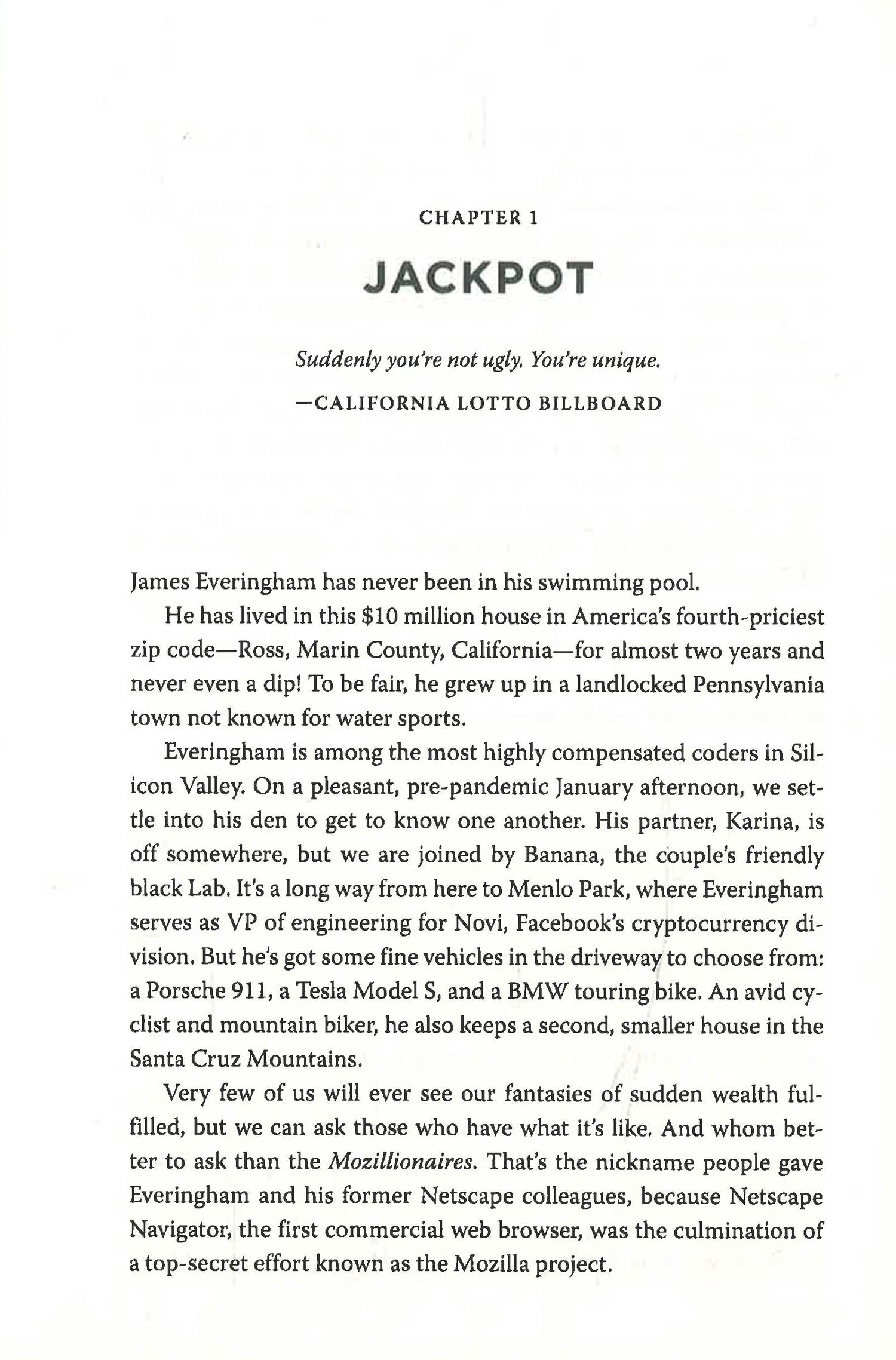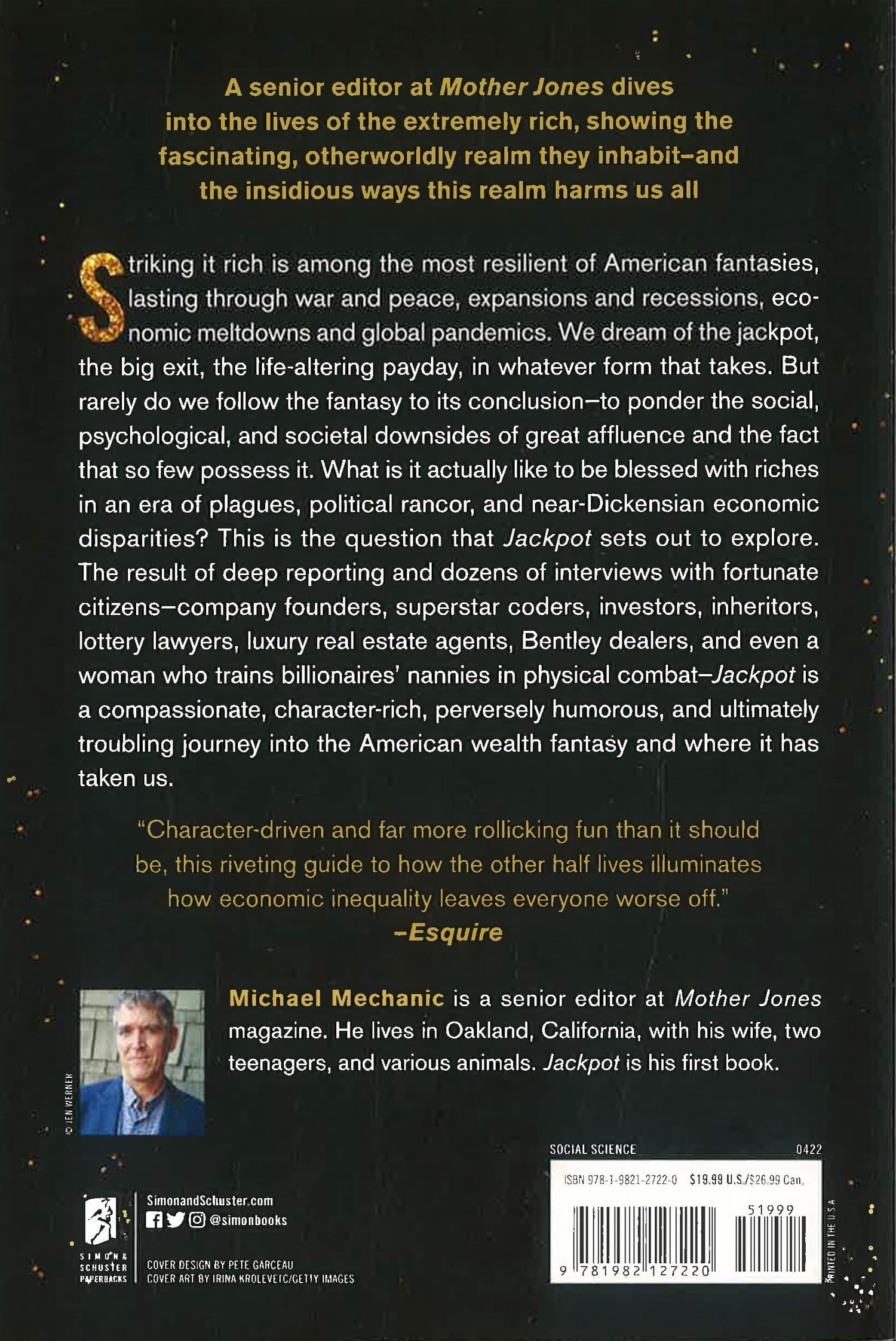 These are all questions that Jackpot sets out to explore. The result of deep reporting and dozens of interviews with fortunate citizens—company founders and executives, superstar coders, investors, inheritors, lottery winners, lobbyists, lawmakers, academics, sports agents, wealth and philanthropy professionals, concierges, luxury realtors, Bentley dealers, and even a woman who trains billionaires’ nannies in physical combat, Jackpot is a compassionate, character-rich, perversely humorous, and ultimately troubling journey into the American wealth fantasy and where it has taken us.
