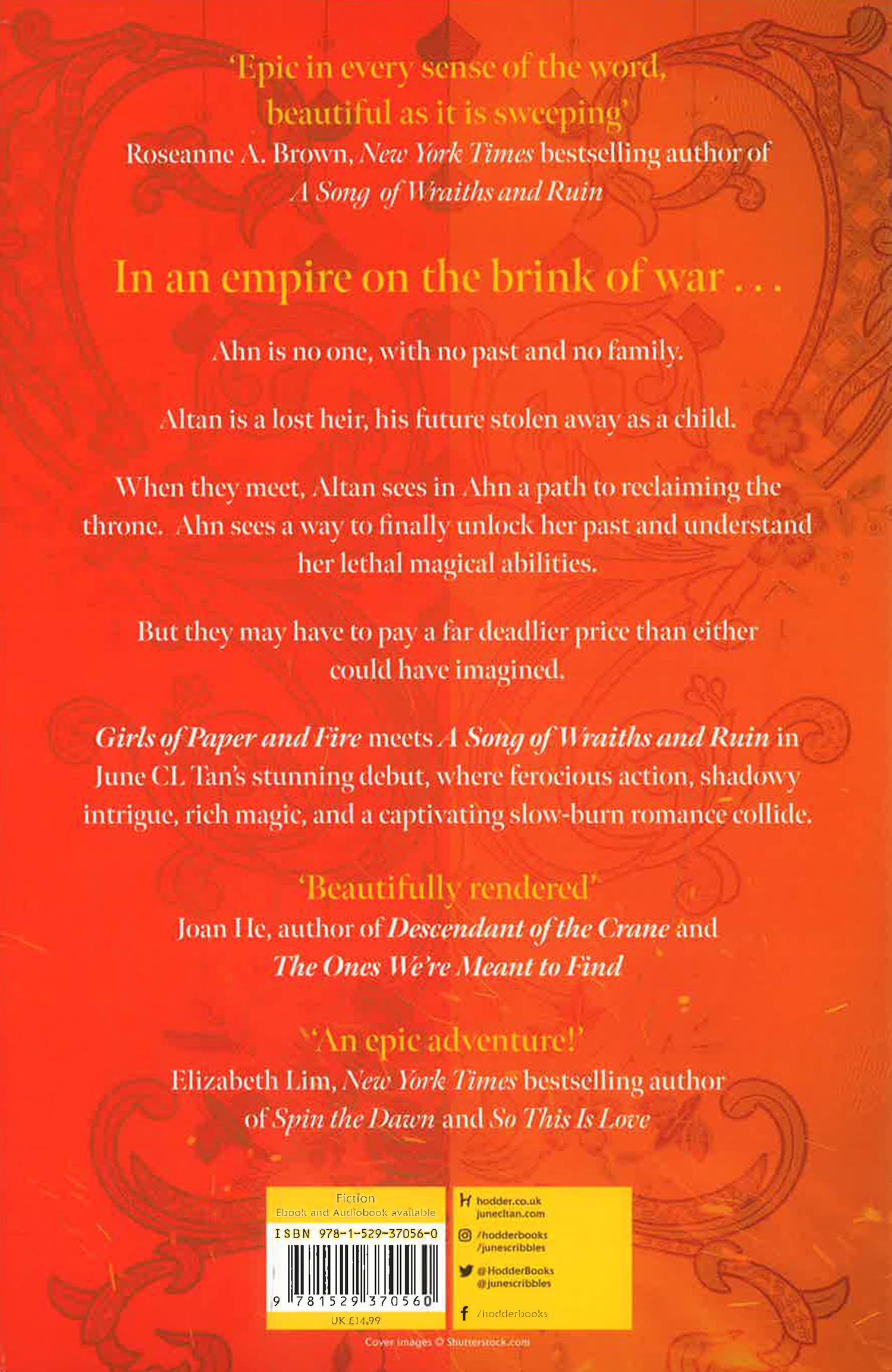 Her destiny. His revenge. In an empire on the brink of war . . . Ahn is no one, with no past and no family. Altan is a lost heir, his future stolen away as a child. When they meet, Altan sees in Ahn a path to reclaiming the throne. Ahn sees a way to finally unlock her past and understand her lethal magical abilities. But they may have to pay a far deadlier price than either could have imagined. Girls of Paper and Fire meets A Song of Wraiths and Ruin in June CL Tan's stunning debut, where ferocious action, shadowy intrigue, rich magic, and a captivating slow-burn romance collide. 'Impossible to put down' Swati Teerdhala, author of The Tiger at Midnight series 'Adventure at its finest' Joan He, author of Descendant of the Crane 'An epic adventure!' Elizabeth Lim, New York Times bestselling author of Spin the Dawn 'Epic in every sense of the word, beautiful as it is sweeping' Roseanne A. Brown, New York Times bestselling author of A Song of Wraiths and Ruin