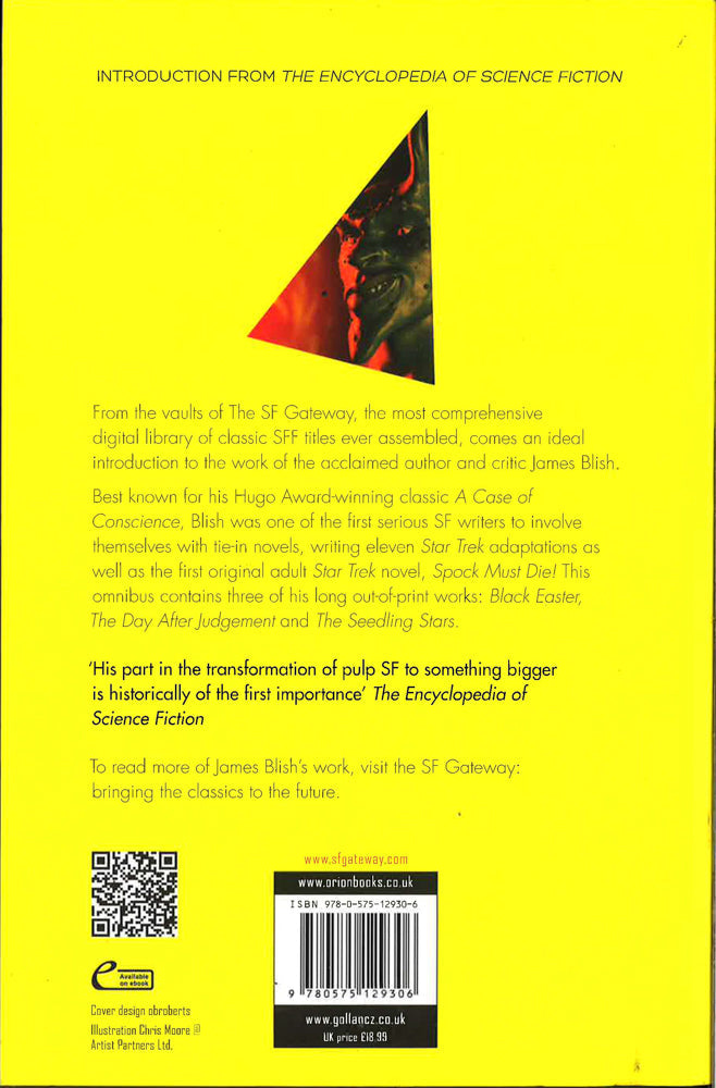 From the vaults of The SF Gateway, the most comprehensive digital library of classic SFF titles ever assembled, comes an ideal introduction to the work of the acclaimed author and critic James Blish.Best known for his Hugo Award-winning classic A Case of Conscience, Blish was one of the first serious SF writers to involve themselves with tie-in novels, writing eleven Star Trek adaptations as well as the first original adult Star Trek novel, Spock Must Die. This omnibus contains three of his long out-of-print works: Black Easter, The Day After Judgement and The Seedling Stars. BLACK EASTER: A gripping story about primal evil: a sinister intermingling of power, politics, modern theology, the dark forces of necromancy, and what proves, all too terribly, not to be superstition. THE DAY AFTER JUDGEMENT: Develops and extends the characters from BLACK EASTER. It suggests that God may not be dead, or that demons may not be inherently self-destructive, as something appears to be restraining the actions of the demons upon Earth. THE SEEDLING STARS: You didn't make an Adapted Man with just a wave of the wand. It involved an elaborate constellation of techniques, known collectively as pantropy, that changed the human pattern in a man's shape and chemistry before he was born. And the pantropists didn't stop there. Education, thoughts, ancestors and the world itself were changed, because the Adapted Men were produced to live and thrive in the alien environments found only in space. They were crucial to a daring plan to colonize the universe.