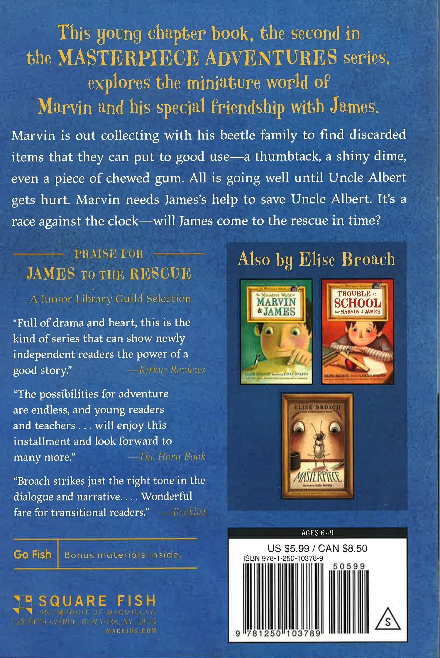 In this Masterpiece Adventure, the second in a chapter book series for younger readers from bestselling author Elise Broach, Marvin the beetle is going collecting with his family. All is good and well until Uncle Albert gets hurt. Marvin needs James's help to save Uncle Albert before it's too late.James to the Rescue captures the miniature world of Marvin the beetle and his special friendship with James.