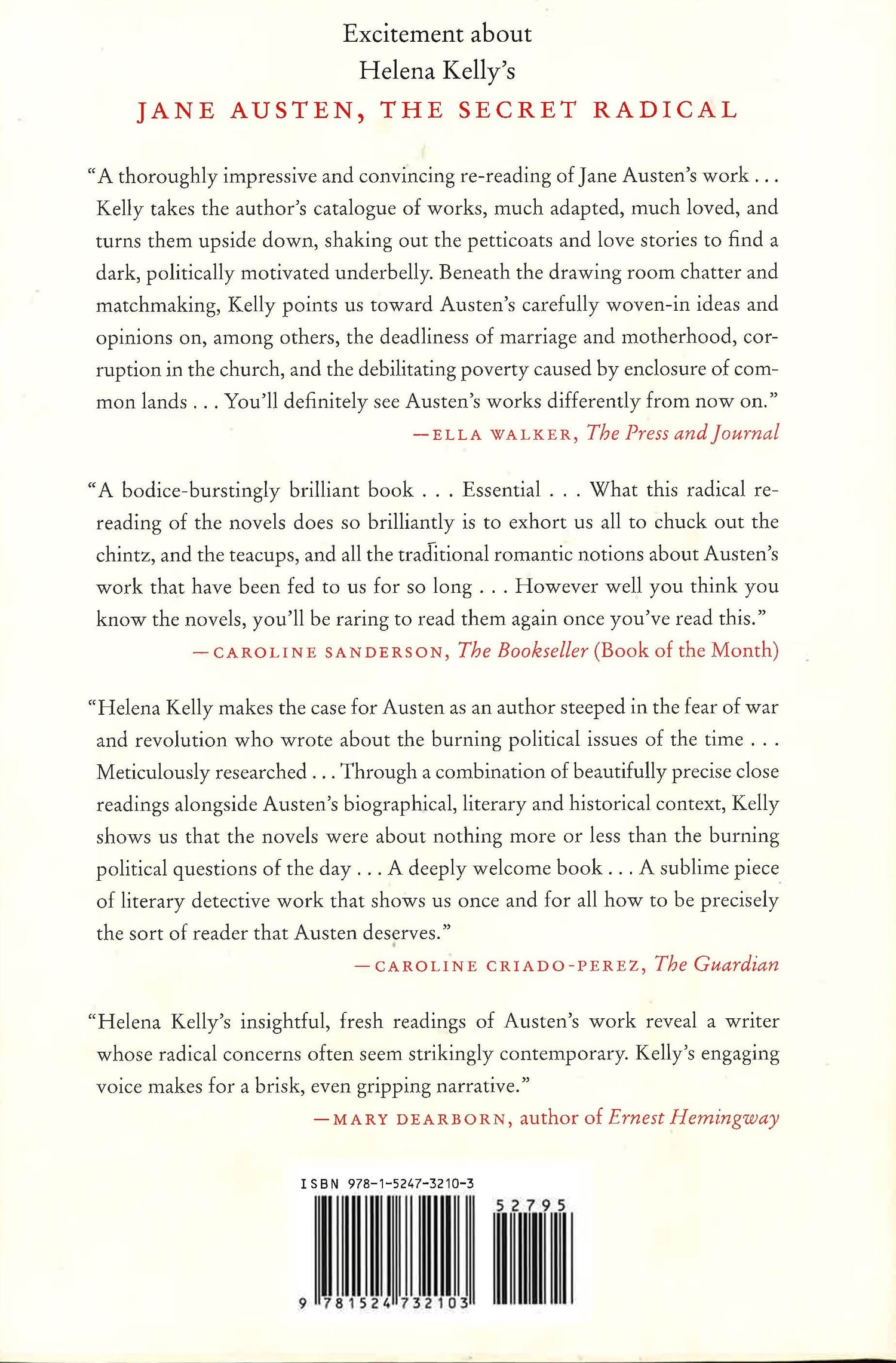 A brilliant, illuminating reassessment of the life and work of Jane Austen that makes clear how Austen has been misread for the past two centuries and that shows us how she intended her books to be read, revealing, as well, how subversive and daring--how truly radical--a writer she was. In this fascinating, revelatory work, Helena Kelly--dazzling Jane Austen authority--looks past the grand houses, the pretty young women, past the demure drawing room dramas and witty commentary on the narrow social worlds of her time that became the hallmark of Austen's work to bring to light the serious, ambitious, deeply subversive nature of this beloved writer. Kelly illuminates the radical subjects--slavery, poverty, feminism, the Church, evolution, among them--considered treasonous at the time, that Austen deftly explored in the six novels that have come to embody an age. The author reveals just how in the novels we find the real Jane Austen: a clever, clear-sighted woman "of information," fully aware of what was going on in the world and sure about what she thought of it. We see a writer who understood that the novel--until then seen as mindless "trash"--could be a great art form and who, perhaps more than any other writer up to that time, imbued it with its particular greatness.