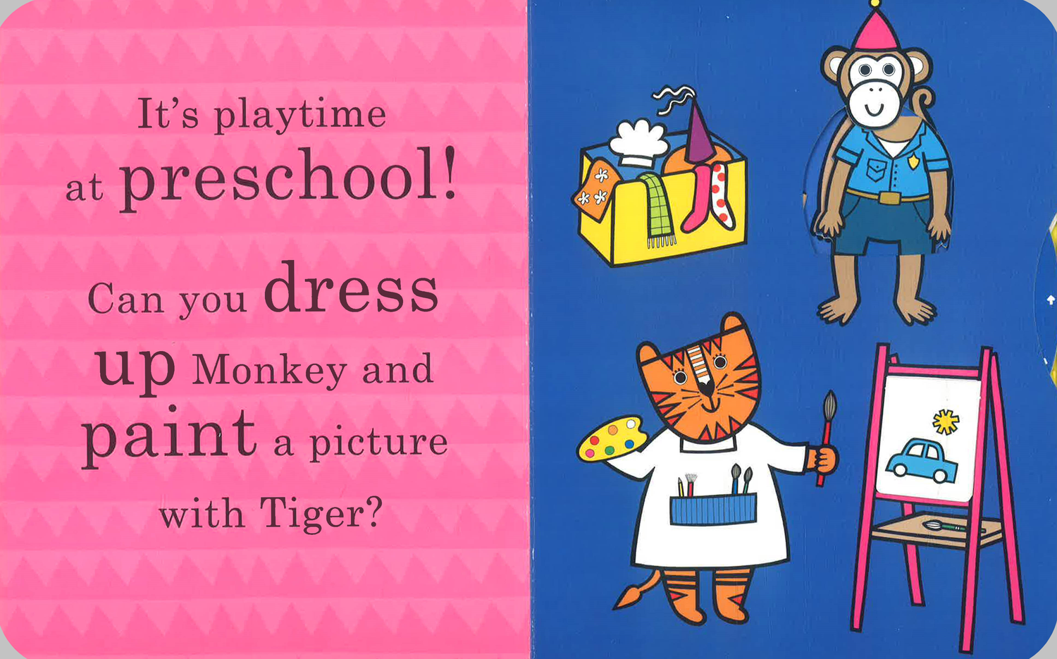 It's playtime! Can you paint with Tiger and dress up Monkey? In this fun new series, little ones learn first words and experiences by using satisfying sliders and sturdy flaps. Each spread introduces a new scenario with characteristic vibrant artwork from acclaimed artist Jane Foster.