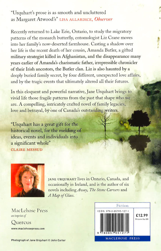 A novel of family legacies, love and betrayal. Jane Urquhart's stunning new novel weaves elements from the nineteenth century in Ireland and Ontario into a contemporary story of events in the lives of one family. Recently returned to Lake Erie to study the migratory patterns of the monarch butterfly, entomologist Liz Crane moves into her family's now-deserted farmhouse. Casting a shadow over her life is the recent death of her cousin, Amanda Butler, a gifted military strategist killed in Afghanistan, and the disappearance many years earlier of her irrepressible, charismatic uncle. Liz explores the many-layered history of the eccentric Butler family, ancestral lighthouse-keepers, agriculturalists and dreamers and re-evaluates the lives of the seasonal workers imported each summer from Mexico to harvest the fruit on the farm, with them Teo, a young boy alone in his apartness. Surrounded by memories, Liz herself is haunted by a deeply buried family secret, by four different, unexpected love affairs, and by the tragic events that ultimately altered all their futures. In this eloquent and powerful narrative, Jane Urquhart brings to vivid life those fragile patterns of the past that shape who we are, and shows the extent to which we can be influenced by absences on the difficult path to understanding and forgiveness.