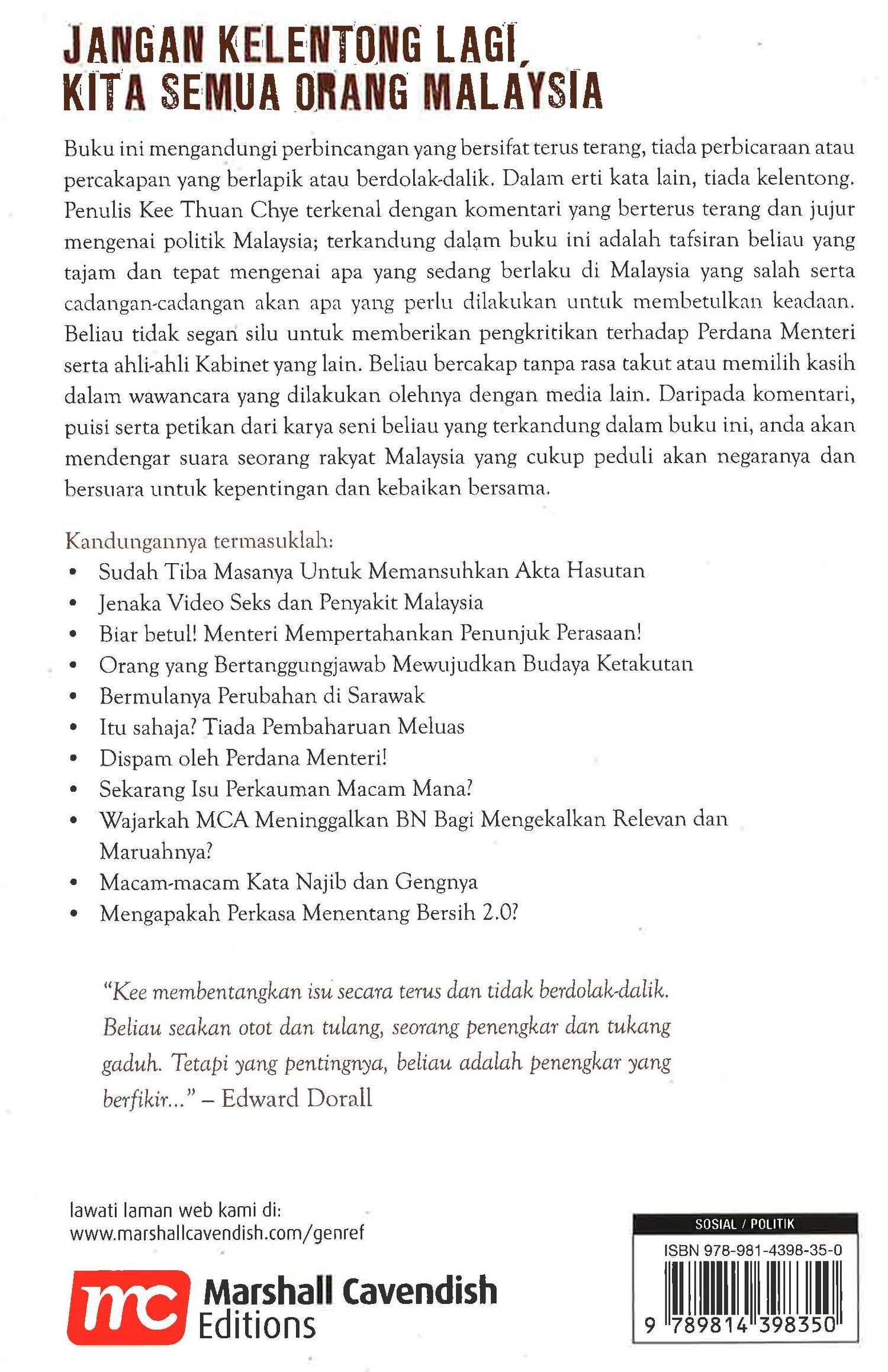 Buku ini mengandungi perbincangan yang bersifat terus terang, tiada pembicaraan atau percakapan yang berlapik atau berdolak-dalik. Dalam erti kata lain, tiada kelentong. Penulis Kee Thuan Chye terkenal dengan komentari yang berterus terang dan jujur mengenai politik Malaysia; terkandung dalam buku ini adalah tafsiran beliau yang tajam dan tepat mengenai apa yang sedang berlaku di Malaysia yang salah serta cadangan-cadangan akan apa yang perlu dilakukan untuk membetulkan keadaan. Beliau tidak segan silu untuk memberikan pengkritikan terhadap Perdana Menteri serta ahli-ahli Kabinet yang lain. Beliau bercakap tanpa rasa takut atau memilih kasih dalam wawancara yang dilakukan olehnya dengan media lain. Daripada komentari, puisi serta petikan dari karya seni beliau yang terkandung dalam buku ini, anda akan mendengar suara seorang rakyat Malaysia yang cukup peduli akan negaranya dan bersuara untuk kepentingan dan kebaikan bersama.