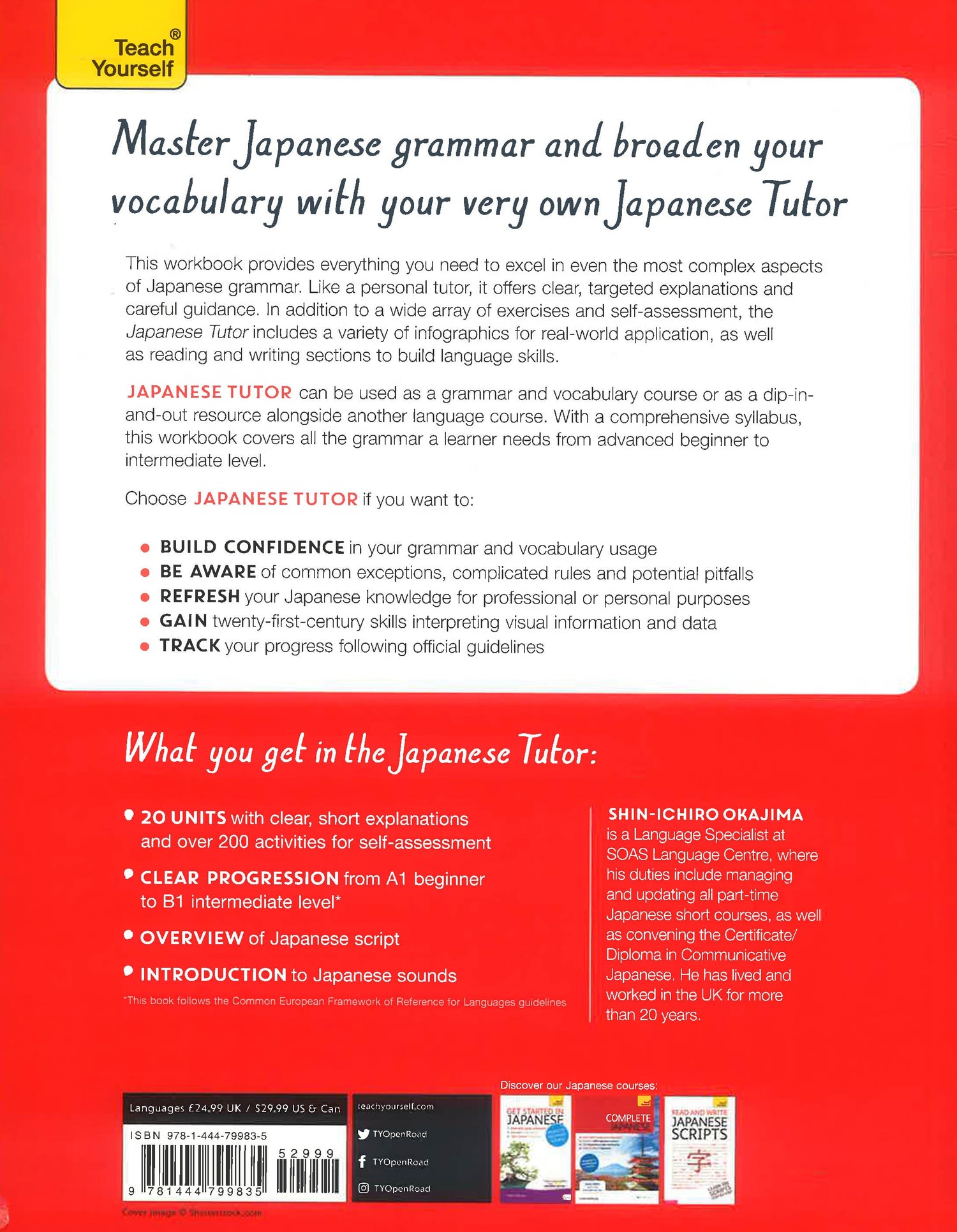 The Japanese Tutor: Grammar and Vocabulary Workbook can be used as a standalone course or as a complement to any other Japanese course. It offers extensive practice and review of essential grammar points and vocabulary and skills building. The personal tutor element points out exceptions and gives tips to really help you perfect your Japanese.