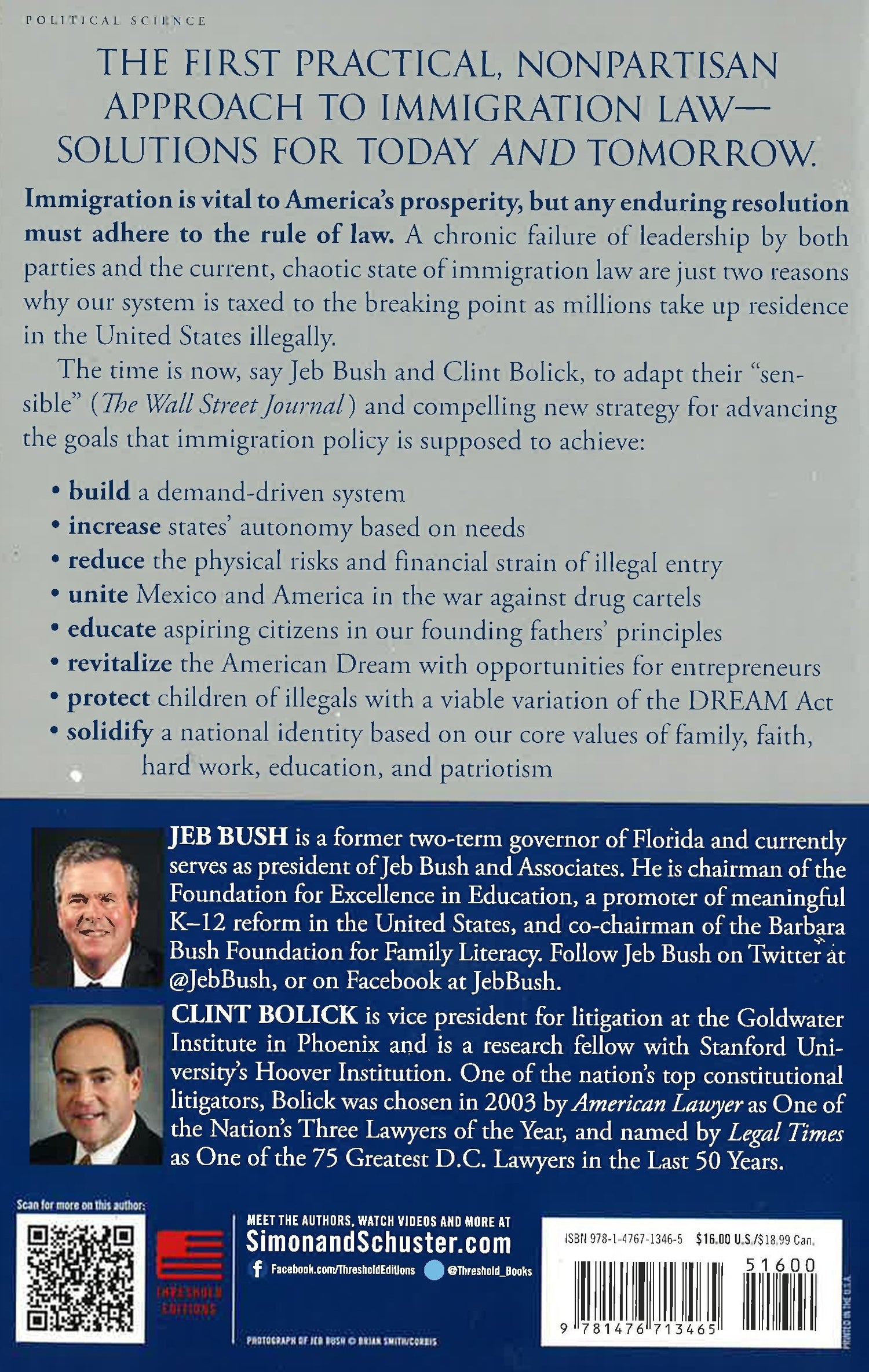 From the former Republican governor of Florida and a leading constitutional litigator comes a timely and provocative look at one of the most divisive issues facing the nation today--"a must-read for every citizen, wannabe citizen, legal working resident, and those illegally working in the shadows of our economy" (The Washington Times). The immigration debate has challenged our nation since its founding. But today, it divides Americans more stridently than ever, due to a chronic failure of national leadership by both parties. Here at last is an attainable resolution guided by two core principles: first, immigration is vital to America's future; second, any enduring resolution must adhere to the rule of law. Unfortunately, current laws are so cumbersome and irrational that millions have circumvented them and entered the United States illegally, taxing our system to the breaking point. Jeb Bush and Clint Bolick contend there are other unique factors currently at play: America's future population expansion will come solely from immigrants. And for the first time, the U.S. must compete with other countries for immigrant workers and their skills. In the first book to offer a practical, nonpartisan approach, Bush and Bolick propose a compelling six-point strategy for reworking our policies that begins with erasing all existing, outdated immigration structures and starting over. From there, Immigration Wars details their plan for advancing the national goals that immigration policy is supposed to achieve: build a demand-driven immigration system; increase states' autonomy based on varying needs; reduce the significant physical risks and financial costs imposed by illegal immigration; unite Mexico and America in their common war against drug cartels; and educate aspiring citizens in our nation's founding principles and why they still matter. Here too is a viable variation of the DREAM Act as a legal status for children brought here illegally, and sound strategies for the Republican Party to revitalize their ever-decreasing core constituency. With Immigration Wars as a beacon of hope, Americans can finally solidify a national identity that is based on a set of ideals enriched and reinvigorated by immigrants, most of whom fervently embrace our core values--family, faith, hard work, education, and patriotism.