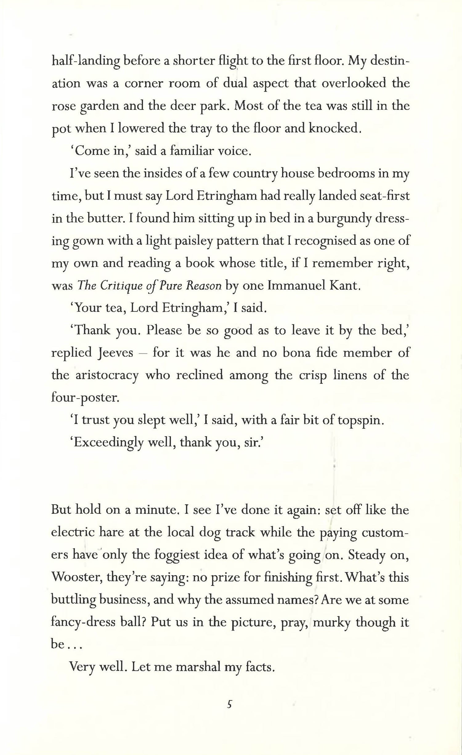 As is so often the case, love is the cause of the confusion. You see, Bertie met Georgiana, Georgiana liked Bertie, the feeling was mutual. Though he could be said to suffer from a reputation for flirtations, it looks as though this is the real deal. However, Georgiana is a ward of Sir Henry Hackwood and, in order to maintain his beloved Melbury Hall, Hackwood has already struck a deal would see Georgiana becoming Mrs Rupert Venables. Meanwhile, Peregrine ‘Woody’ Beeching is trying to regain the trust of his fiancée Amelia. But why would this necessitate Bertie having to pass himself off as a valet when he has never so much as made a cup of tea? Could it be that every loyal, self-effacing, Kant loving, Jeeves has an ulterior motive? But future happiness is not the only thing at there is a frightfully important cricket match and the loaded question of who one fancies for Ascot.