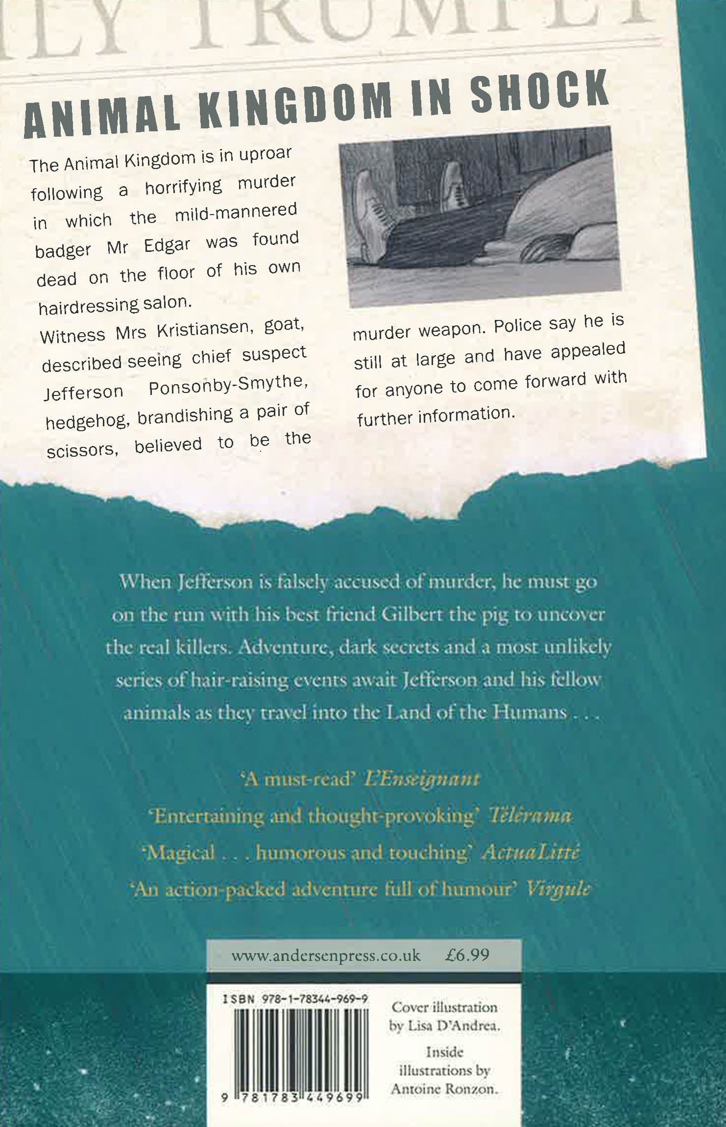 Winner of the PEN Translates Award Jean-Claude Mourlevat is the 2021 winner of the Astrid Lindgren Memorial Award When Jefferson the hedgehog goes to his hairdresser’s, he’s shocked to discover the barber lying dead on the floor. Falsely accused of murder, Jefferson must go on the run with his best friend Gilbert the pig to uncover the real killers. Adventure, dark secrets and a most unlikely series of hair-raising events await Jefferson and his fellow animals as they travel into the Land of the Humans . . . With a cover by Lisa d’Andrea, and inside illustrations by Antoine Ronzon Translated by Ros Schwartz