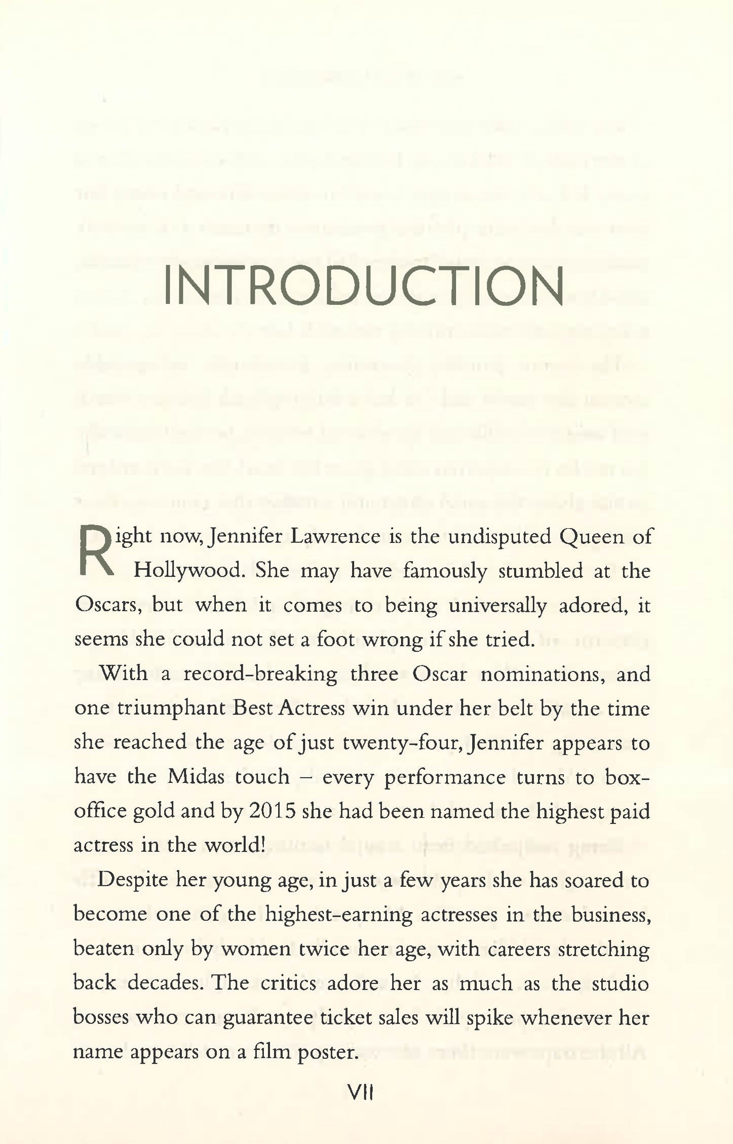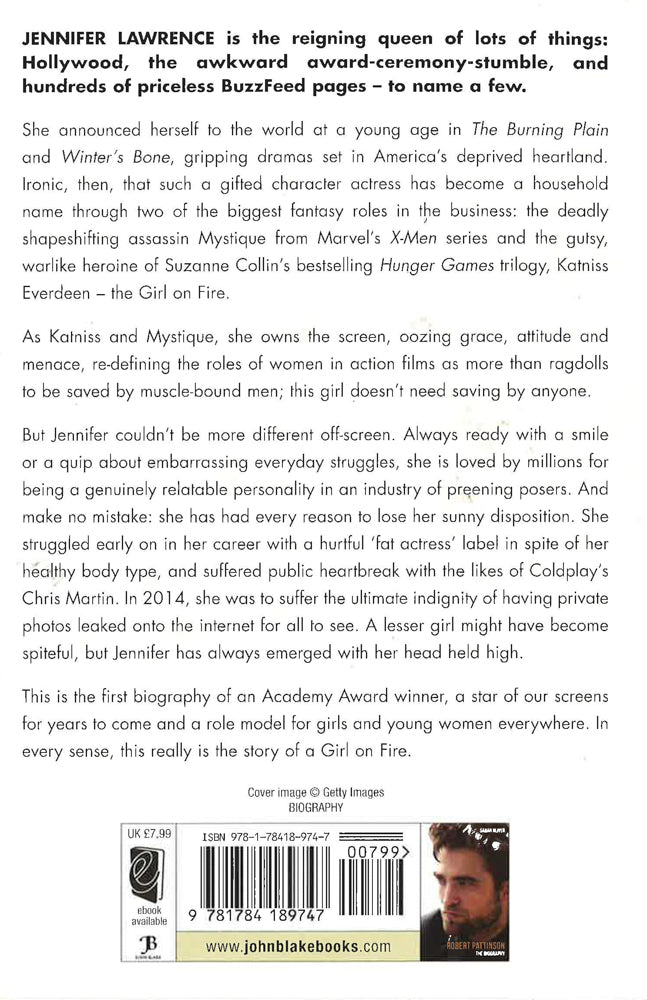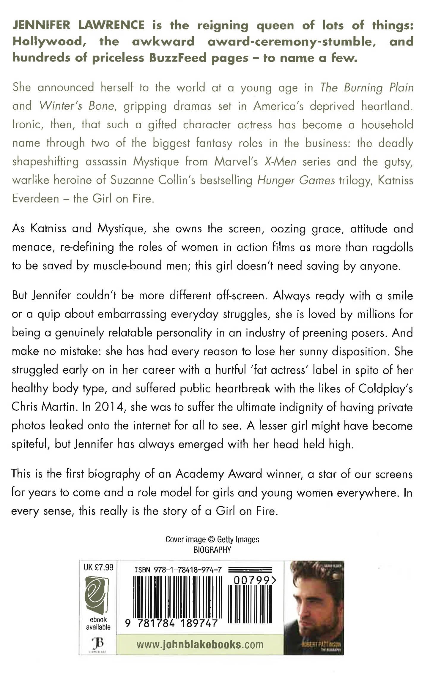 Jennifer Lawrence is the reigning queen of lots of things: Hollywood, the awkward award-ceremony-stumble, and hundreds of priceless Buzzfeed pages - to name a few. This is the first biography of an Academy Award winner, a star of our screens for years to come and a role model for girls and young women everywhere. Jennifer Lawrence is the reigning queen of lots of things: Hollywood, the awkward award-ceremony-stumble, and hundreds of priceless Buzzfeed pages - to name a few. She announced herself to the world at a young age in The Burning Plain and Winter's Bone, gripping dramas set in America's deprived heartland. Ironic, then, that such a gifted character actress become a household name through two of the biggest fantasy roles in the business: the deadly shapeshifting assassin Mystique from Marvel's X-Men series and the gutsy, warlike heroine of Suzanne Collin's bestselling Hunger Games trilogy, Katniss Everdeen - the Girl on Fire. As Katniss and Mystique, she owns the screen, oozing grace, attitude and menace, re-defining the roles of women in action films as more than ragdolls to be saved by muscle-bound men; this girl doesn't need saving by anyone. But Jennifer couldn't be more different off-screen. Always ready with a smile or a quip about embarrassing everyday struggles, she is loved by millions for being a genuinely relatable personality in an industry of preening posers. And make no mistake: she has had every reason to lose her sunny disposition.She struggled early on in her career with a hurtful 'fat actress' label in spite of her healthy body type, and suffered public heartbreak with the likes of Coldplay's Chris Martin. In 2014, she was to suffer the ultimate indignity of having private photos leaked onto the internet for all to see. A lesser girl might have become spiteful, but Jennifer has always emerged with her head held high. This is the first biography of an Academy Award winner, a star of our screens for years to come and a role model for girls and young women everywhere. In every sense, this really is the story of a Girl on Fire.