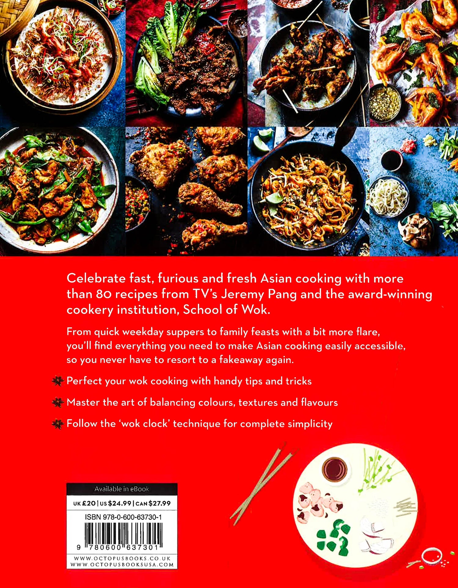 Most recipes in the book utilise the 'wok clock' technique, where the ingredients are laid out in a clock formation in the order they will be cooked for complete simplicity. Wok Wednesdays and Flavor Fridays, all seen on the School of Wok Youtube channel, are also featured.