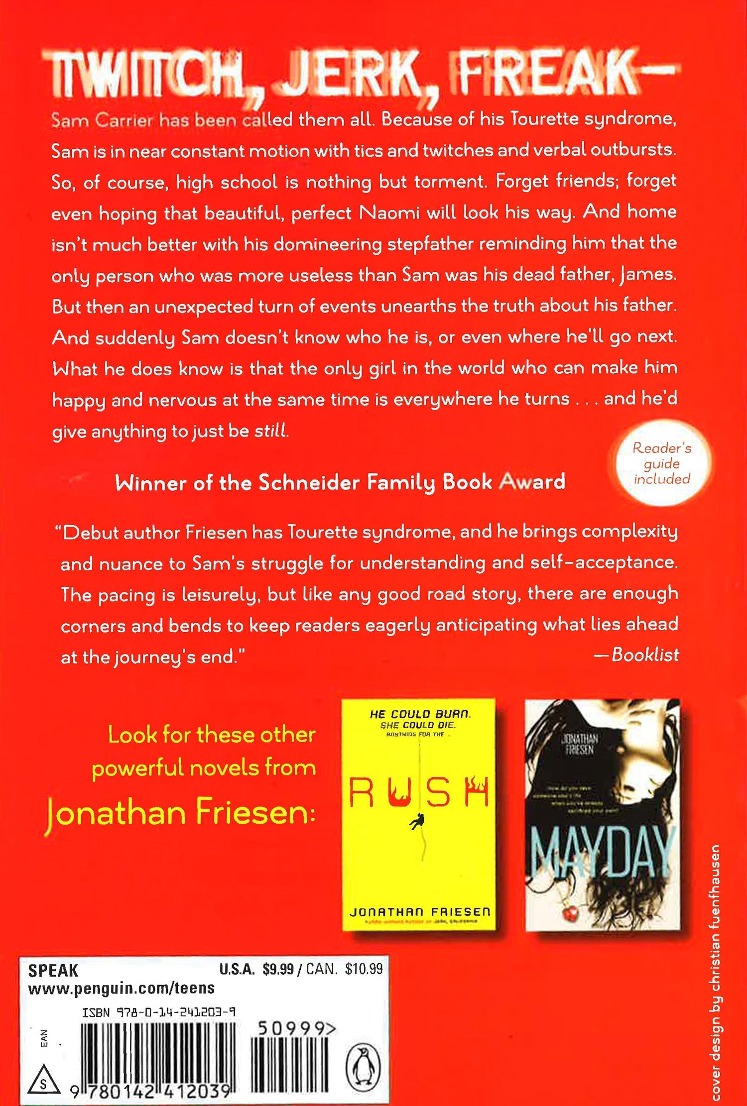 Read Jonathan Friesen's posts on the Penguin Blog. This Schneider Family Book Award winner changed the face of Tourette's Syndrome for modern teens. Wrought with tension, romance, and hope, Jerk, California tells the story of Sam, who sets out on a cross-country quest to learn the truth about his family and his inherited Tourette's Syndrome, along the way finding both love and acceptance. show more