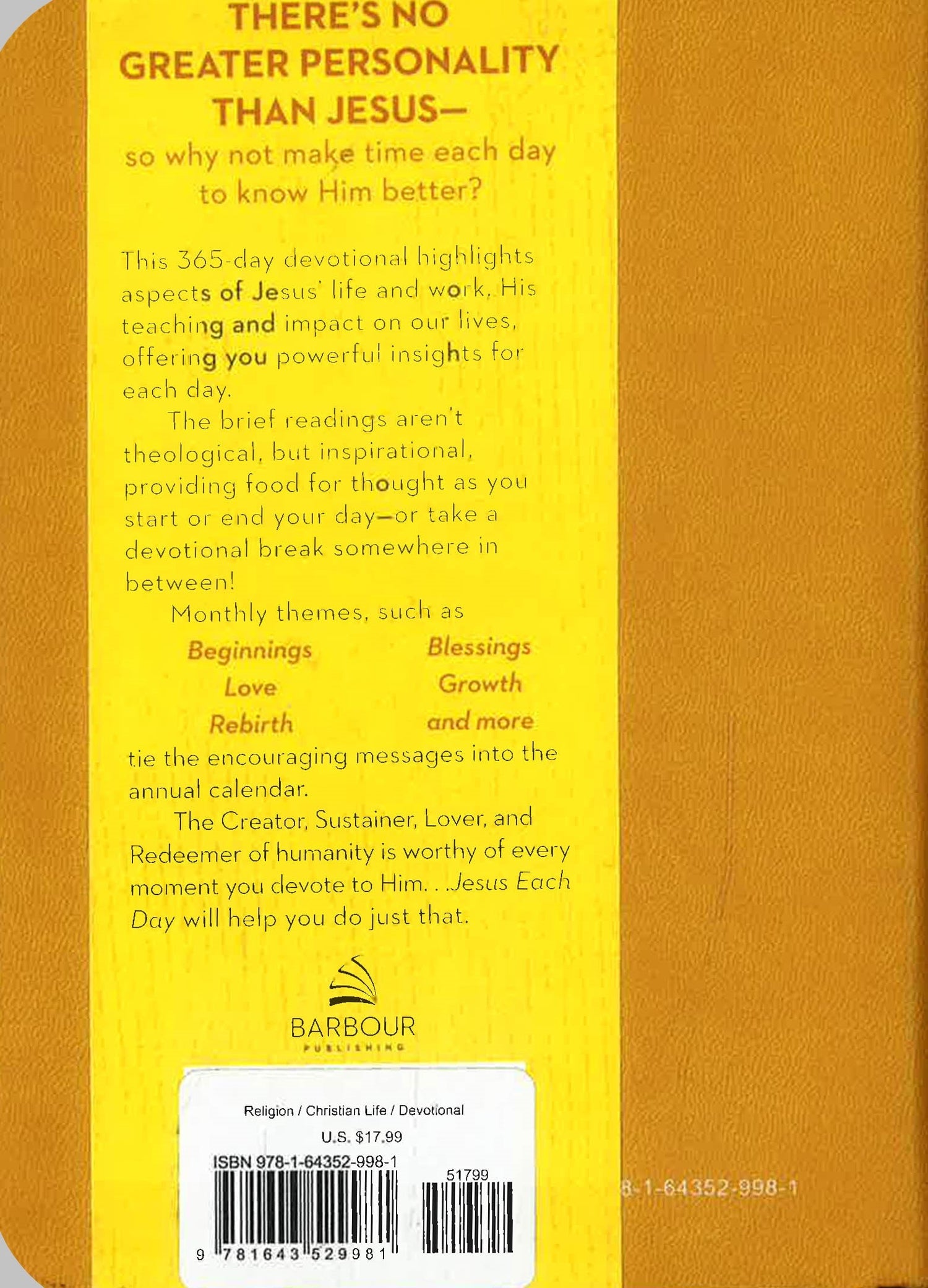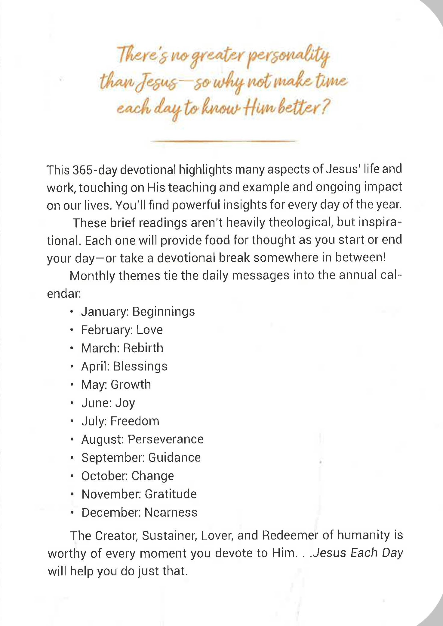 This brand-new, 365-day devotional highlights aspects of Jesus' life and work, His teaching and impact on our lives every day, offering you powerful insights for each day.