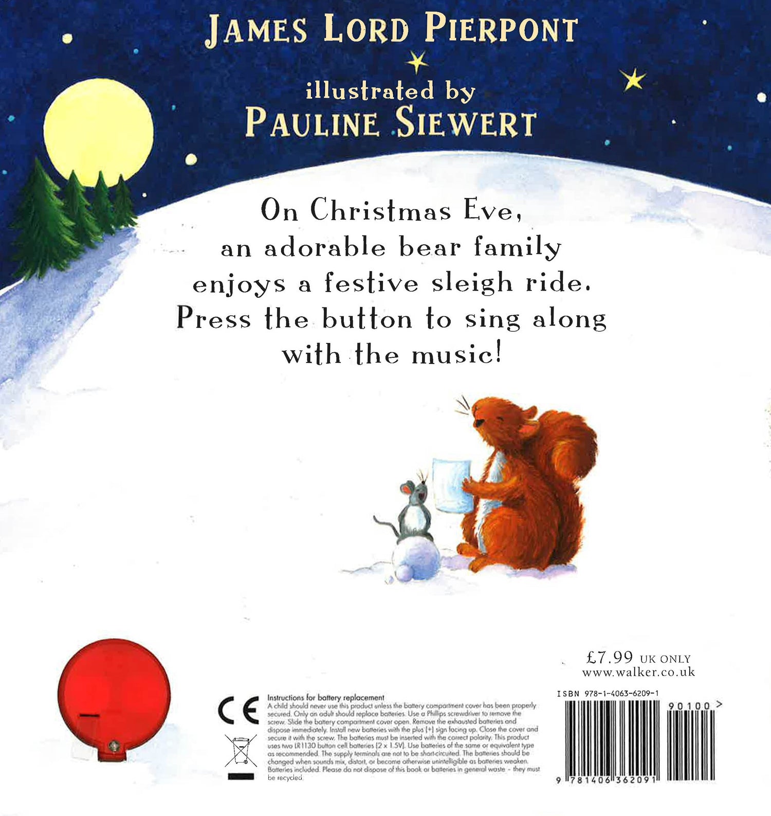Sing along with this musical edition of the favourite Christmas song, "Jingle Bells"! Press the button to hear "Jingle Bells" as you follow the story of an adorable bear family enjoying a festive sleigh ride! "Jingle Bells" is an irreplaceable part of Christmas celebrations, and this is the perfect sound book to share on Christmas Eve. Pauline Siewert's gorgeous illustrations capture the magic of the Christmas season, and with the lyrics on each page, children will love to sing along!