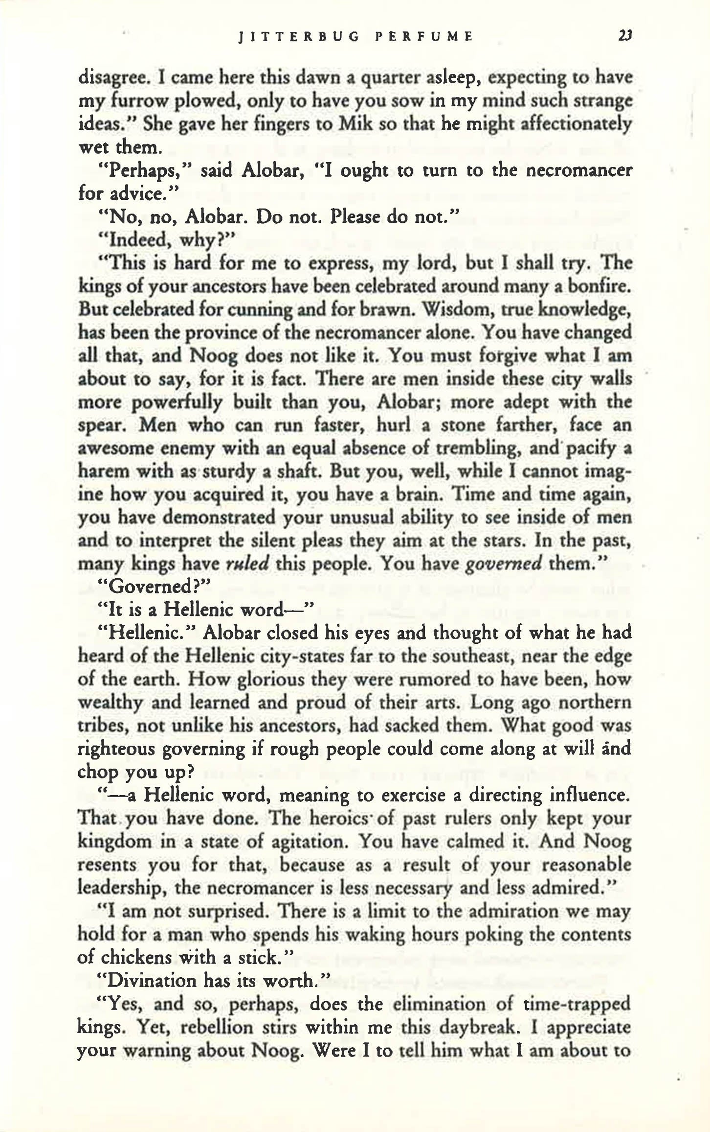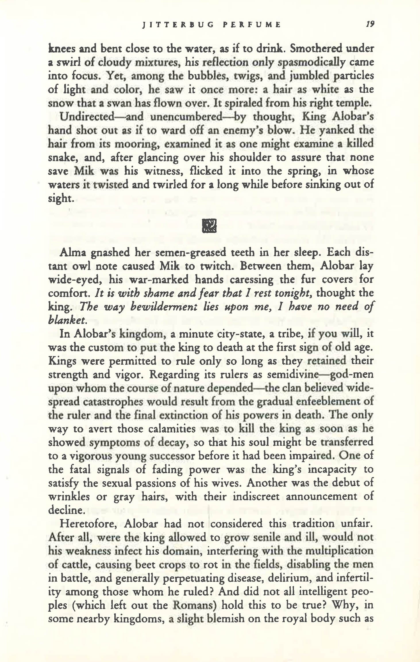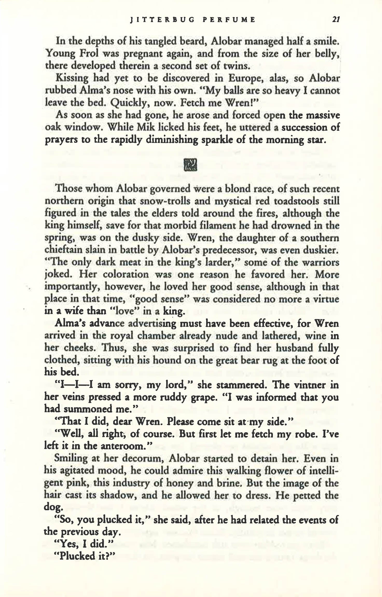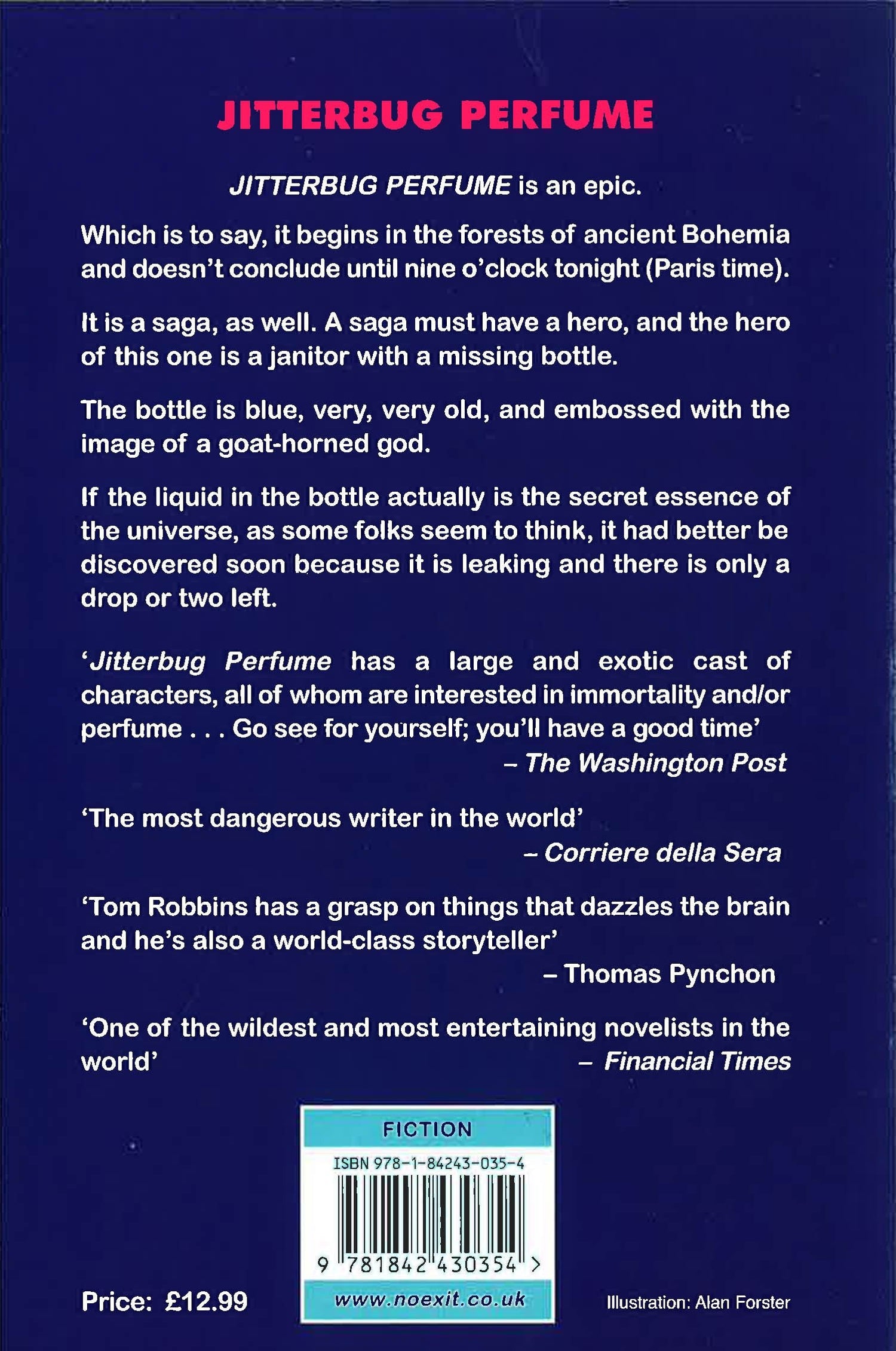 "Jitterbug Perfume" is an epic. which is to say, it begins in the forests of ancient Bohemia and doesn't conclude until nine o'clock tonight [Paris time]. It is a saga, as well. A saga must have a hero, and the hero of this one is a janitor with a missing bottle. The bottle is blue, very, very old, and embossed with the image of a goat-horned god. If the liquid in the bottle is actually is the secret essence of the universe, as some folks seem to think, it had better be discovered soon becaused it is leaking and there is only a drop of two left.