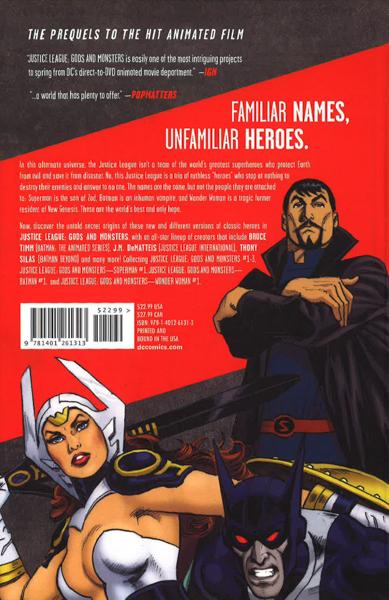 The prequel tales for the acclaimed feature film, JLA: GODS AND MONSTERS is here! In this alternate universe where Superman is Zod's son, Batman is a vampire and Wonder Woman is a descendent of New Genesis, J.M. DeMatteis and Bruce Timm take the Justice League to a new level. Featuring the trinity's origin stories that serve as prequels to the animated film! Collects JUSTICE LEAGUE: GODS AND MONSTERS - BATMAN #1-3, JUSTICE LEAGUE: GODS AND MONSTERS - SUPERMAN #1-3, JUSTICE LEAGUE: GODS AND MONSTERS - WONDER WOMAN #1-3 and JUSTICE LEAGUE: GODS AND MONSTERS #1-9.