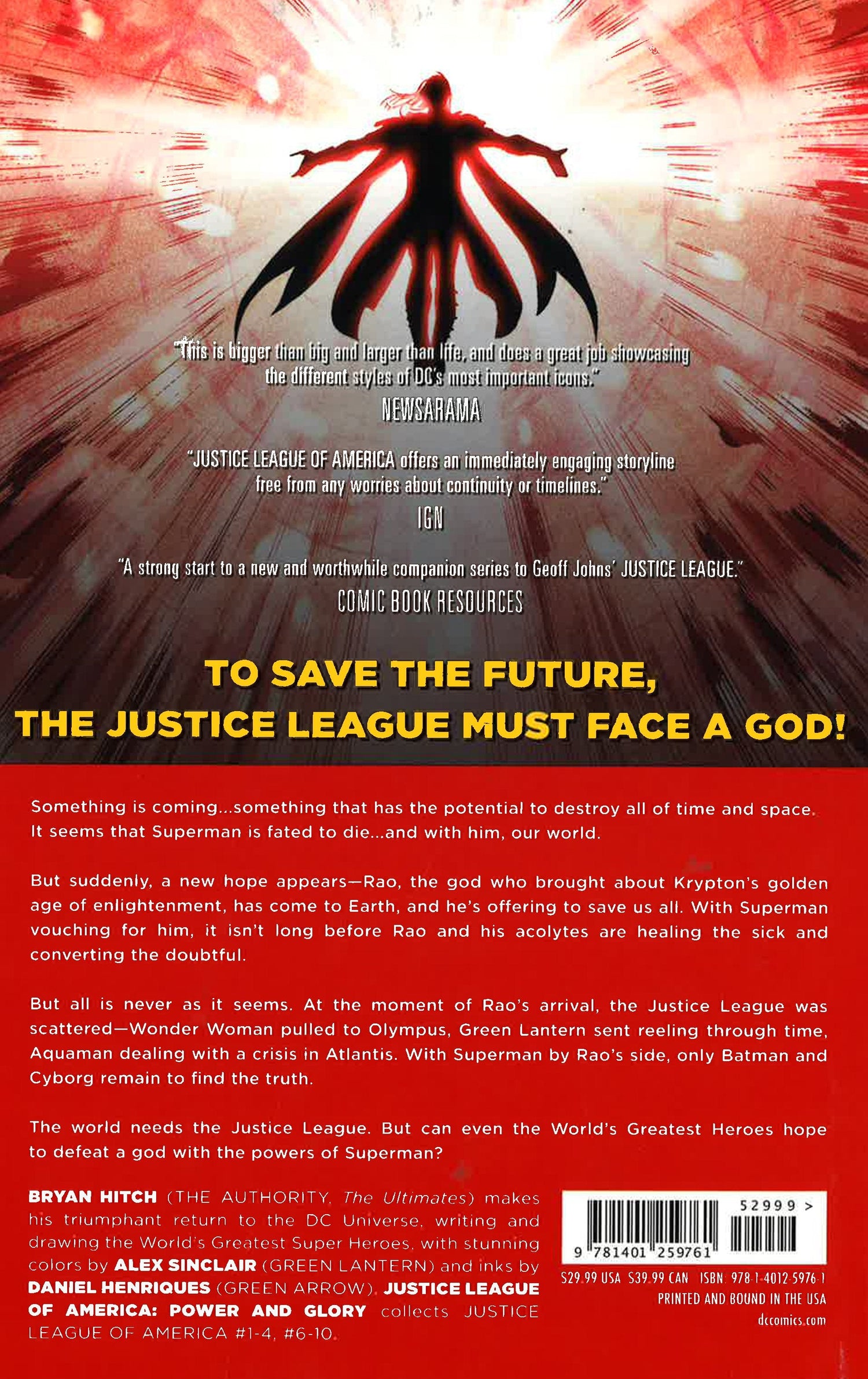 It seems that Superman is fated to die…and with him, our world. But a new hope appears - Rao, the god who brought about Krypton’s golden age of enlightenment. With Superman vouching for him, Rao and his acolytes are healing the sick and converting the doubtful.But all is never as it seems. At the moment of Rao’s arrival, the Justice League was scattered—Wonder Woman pulled to Olympus, Green Lantern sent reeling through time, Aquaman dealing with a crisis in Atlantis. With Superman by Rao’s side, only Batman and Cyborg remain to find the truth.The world needs the Justice League. But can even the World’s Greatest Heroes hope to defeat a god with the powers of Superman?Bryan Hitch (THE AUTHORITY, The Ultimates) makes his triumphant return to the DC Universe, writing and drawing the World’s Greatest Super Heroes with stunning colors by Alex Sinclair (GREEN LANTERN) and inks by Daniel Henriques (GREEN ARROW). JUSTICE LEAGUE: POWER AND GLORY collects JUSTICE LEAGUE OF AMERICA #1-4, #6-10.