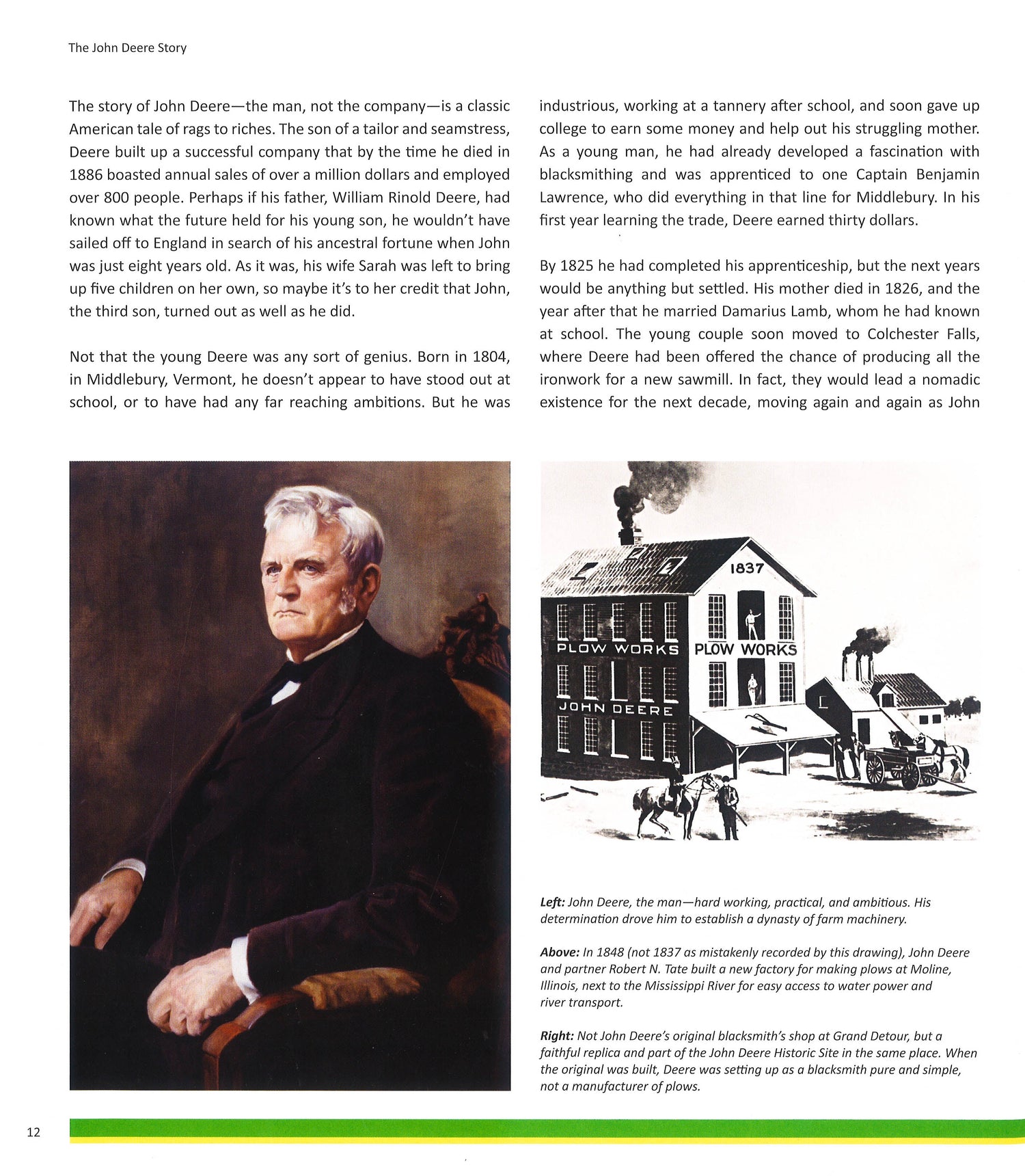 This book tells the fascinating story of how the company's history unfolded. How in the 1830s, a blacksmith named John Deere perfected a polished steel plough that worked so well in the sticky soil of Illinois that he was able to make a fortune, branch out into other tools and found a company that by the turn of the century was building 200,000 implements a year.