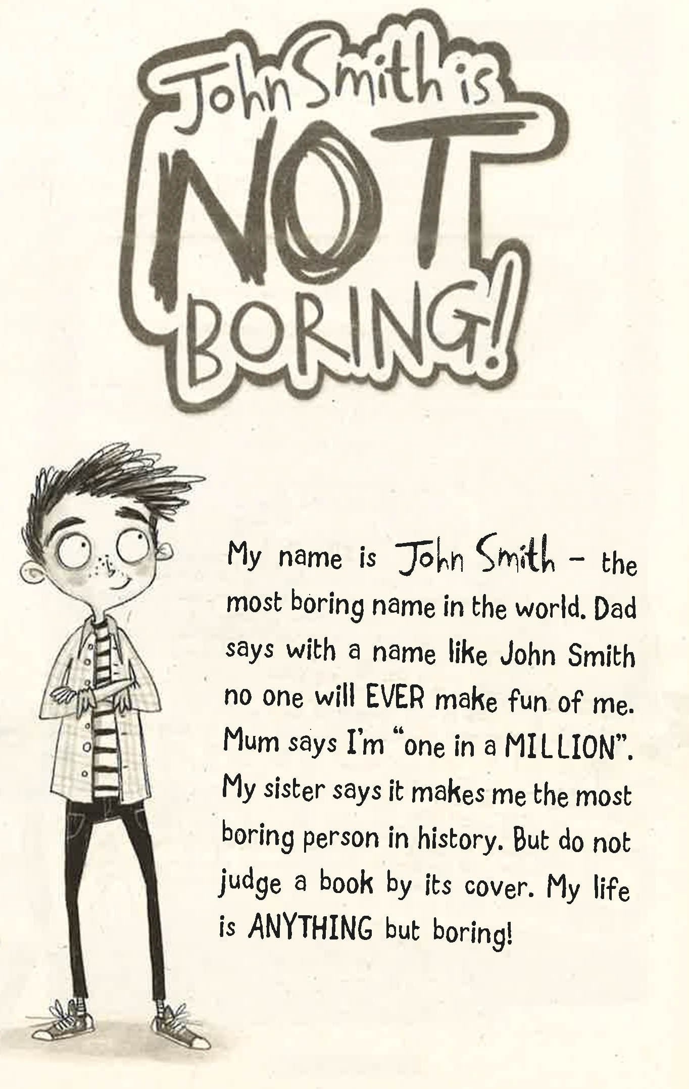 My name is JOHN SMITH. Dad says with a name like John Smith no one will EVER make fun of you. Mum says I'm 'one in a MILLION'. But just because I got what my sister calls 'the most BORING name in the history of names..,.' do not judge a book by its cover. My life is ANYTHING but boring! But here's this thing you should know: I have this massive, massive, MASSIVE secret. I can travel into other worlds and go on AMAZING adventures. Granddad was an adventurer too. It's this big thing we share. Granddad says we're members of something called the John Smith Club. He says you don't have to have a fancy name to have a big adventure - just because you sound like a NOBODY you might be a SOMEBODY. Granddad says if you meet somebody called John Smith, he might have this BIG secret too. I joined the John Smith Club on my last birthday and since then I've been on all kinds of incredible escapades. So now you know.'