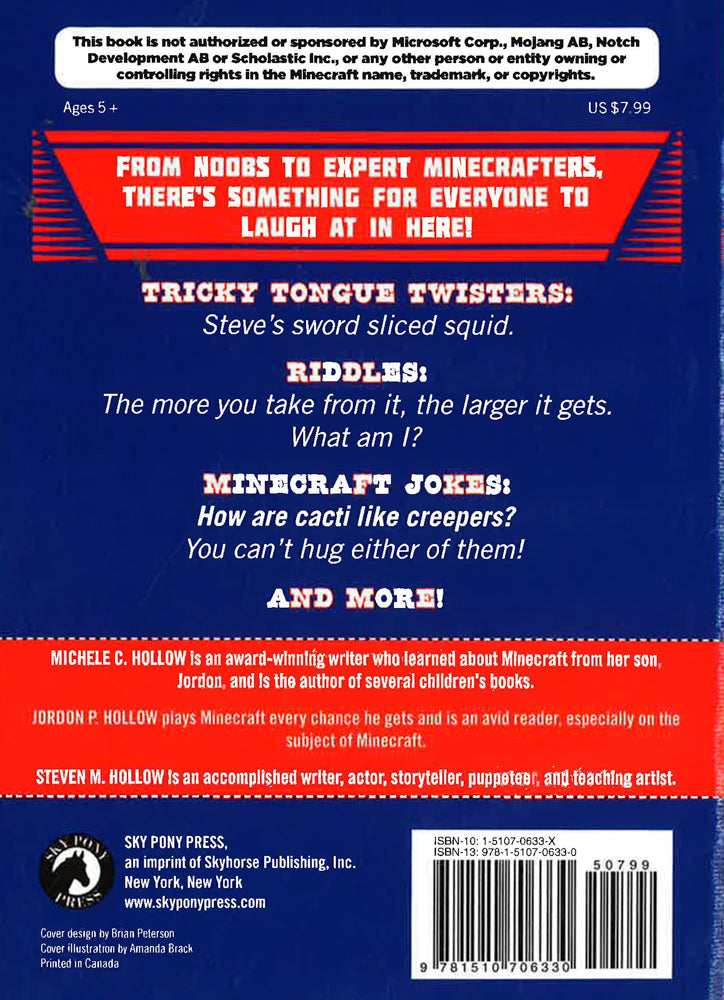 Jokes for Minecrafters is the first book in the new Jokes for Minecrafters series, which celebrates the humor in Minecraft from skeleton mobs to zombie pigmen. Be prepared to laugh! No ghast or blaze is safe from being the punch line of these jokes! Inside you will find hilarious jokes such as: Why did the slime stay home? He had no place to goo! How did Steve know that the skeleton was lying to him? He could see right through him. For kids ages five and up, this is the perfect book for at home, at school, or really anywhere! You'll love telling these silly jokes to your friends and family. As a bonus, you'll find illustrations throughout for even more laughs! Sky Pony Press, with our Good Books, Racehorse and Arcade imprints, is proud to publish a broad range of books for young readers--picture books for small children, chapter books, books for middle grade readers, and novels for young adults. Our list includes bestsellers for children who love stories told with LEGO bricks, books that teach lessons about tolerance, patience, and the environment, and much more. We also publish books for fans of Minecraft and Pokemon GO, including books full of useful hacks, tips, and tricks, as well as Minecraft adventure stories for readers who love the fight of good vs. evil, featuring a magical academy similar to Hogwarts in the Harry Potter saga. While not every title we publish becomes a New York Times bestseller or a national bestseller, we are committed to books on subjects that are sometimes overlooked and to authors whose work might not otherwise find a home.