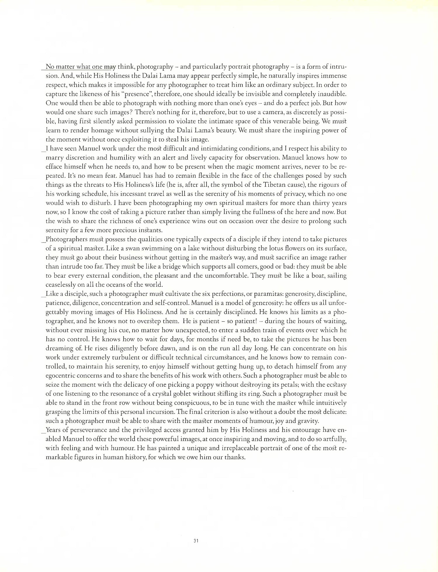 Photographer Manuel Bauer has photographed the Dalai Lama for years. The privileged access granted him by His Holiness and his entourage have enabled Bauer to offer us these powerful images, oscillating between the spiritual and the personal, the public and the intimate, the epic and the anecdotal. About the Swiss-born photographer the Dalai Lama says: "Manuel Bauer is more than simply a professional: he is a close friend of mine. He also knows a great deal about Tibet, about the Tibetan community, and he has spent years making himself familiar with our culture. He understands Tibet comprehensively, as he does the exile community; and he knows me very well too. It is this knowledge that allows his pictures to say so much about their subjects. Bauer paints a unique and irreplacable portrait of one of the most remarkable figures in recent history. And the book contains numerous quotes from and interviews with the Dalai Lama, plus a full timeline about Tibet's yesterday and today. From the early morning until late into the night, and even in our dreams, we experience all kinds of perceptions. We go from being relaxed to being anxious, we feel sometimes anger, sometimes desire, sometimes compassion. Those are transitory states of mind that come and go, from moment to moment. But there must indeed be something that is aware of all this, a continuity of cognition that keeps on experiencing it even after we fall asleep. Yet that something is usually hidden to us, as if behind a curtain. So we need to remove that curtain. Promoting science is very important. After all, it is looking for the same thing as Buddhism: the truth! I am more and more convinced that Buddhist monks, too, should study modern science. They could use science to help understand the nature of atoms and quarks, which would in turn help them to grasp the physical aspects of the Buddhist definition of the transitory nature of all things. That is very important. On the other hand, modern science is not very advanced in the understanding of consciousness, although consciousness, or awareness, is a major physical aspect. There is no doubt that some Tibetans will appreciate this book which I have seen and approved, that they will like it. Others, of course, may be more disturbed by it, and that's only normal. People are so different: just think of Buddha, or Jesus Christ, and of how many people have admired these great masters. And yet at the same time there have also been critical voices among the choruses of praise. This is simply human nature.?Dalai Lama