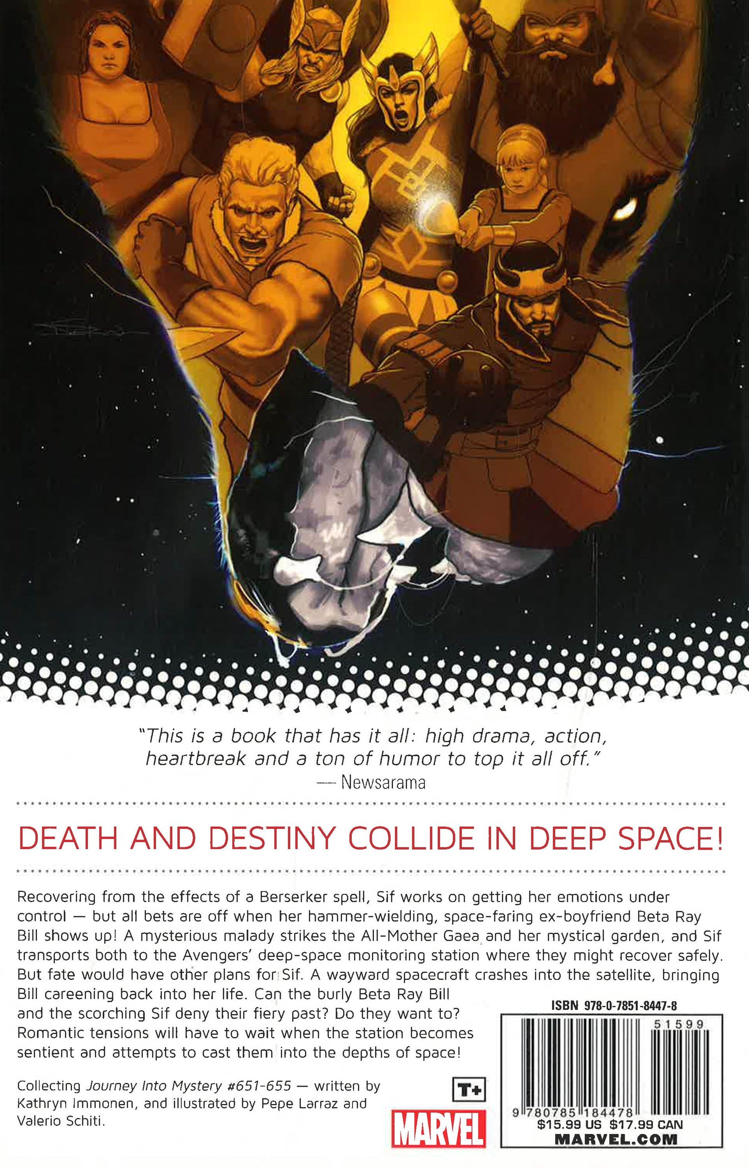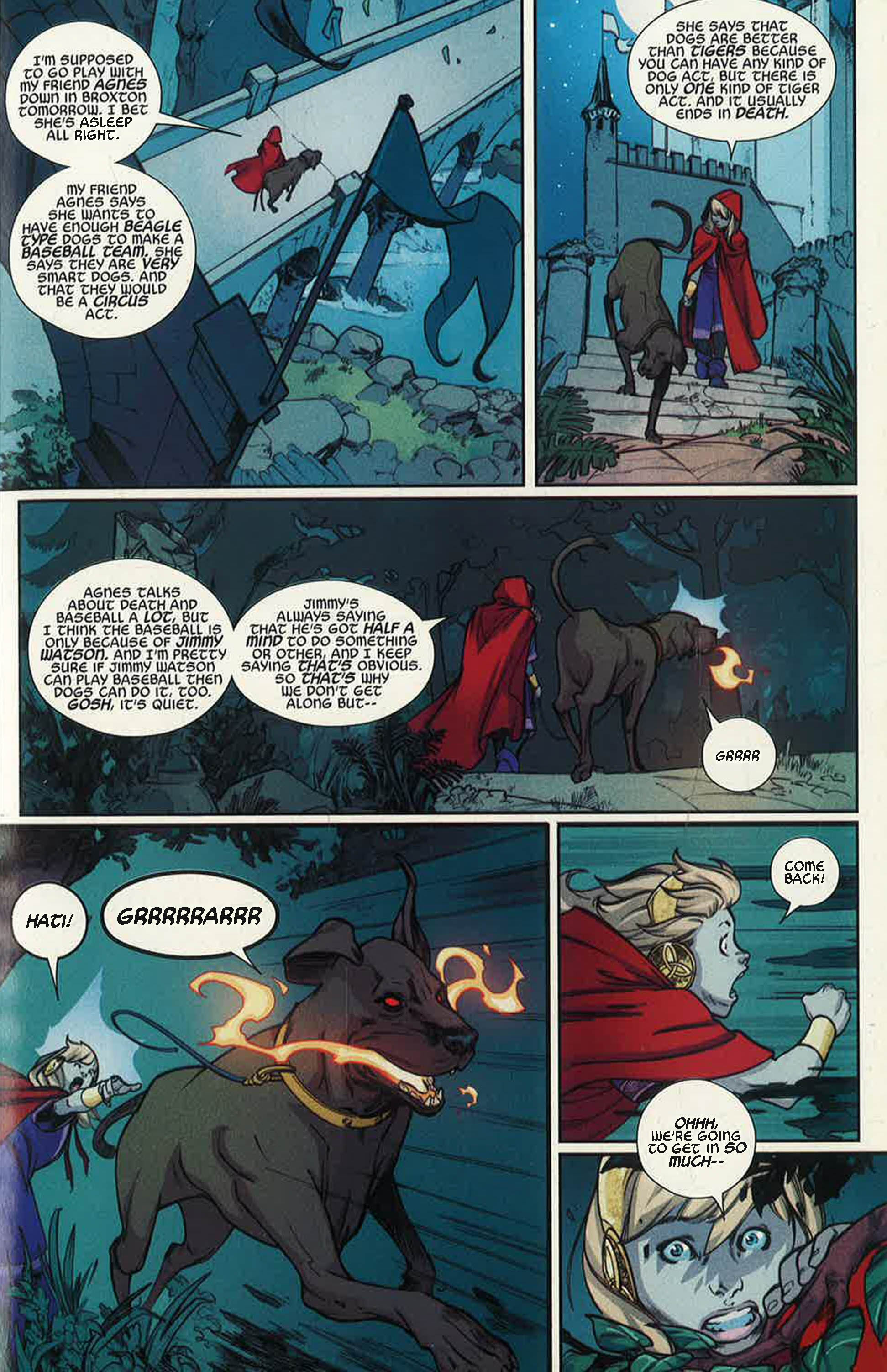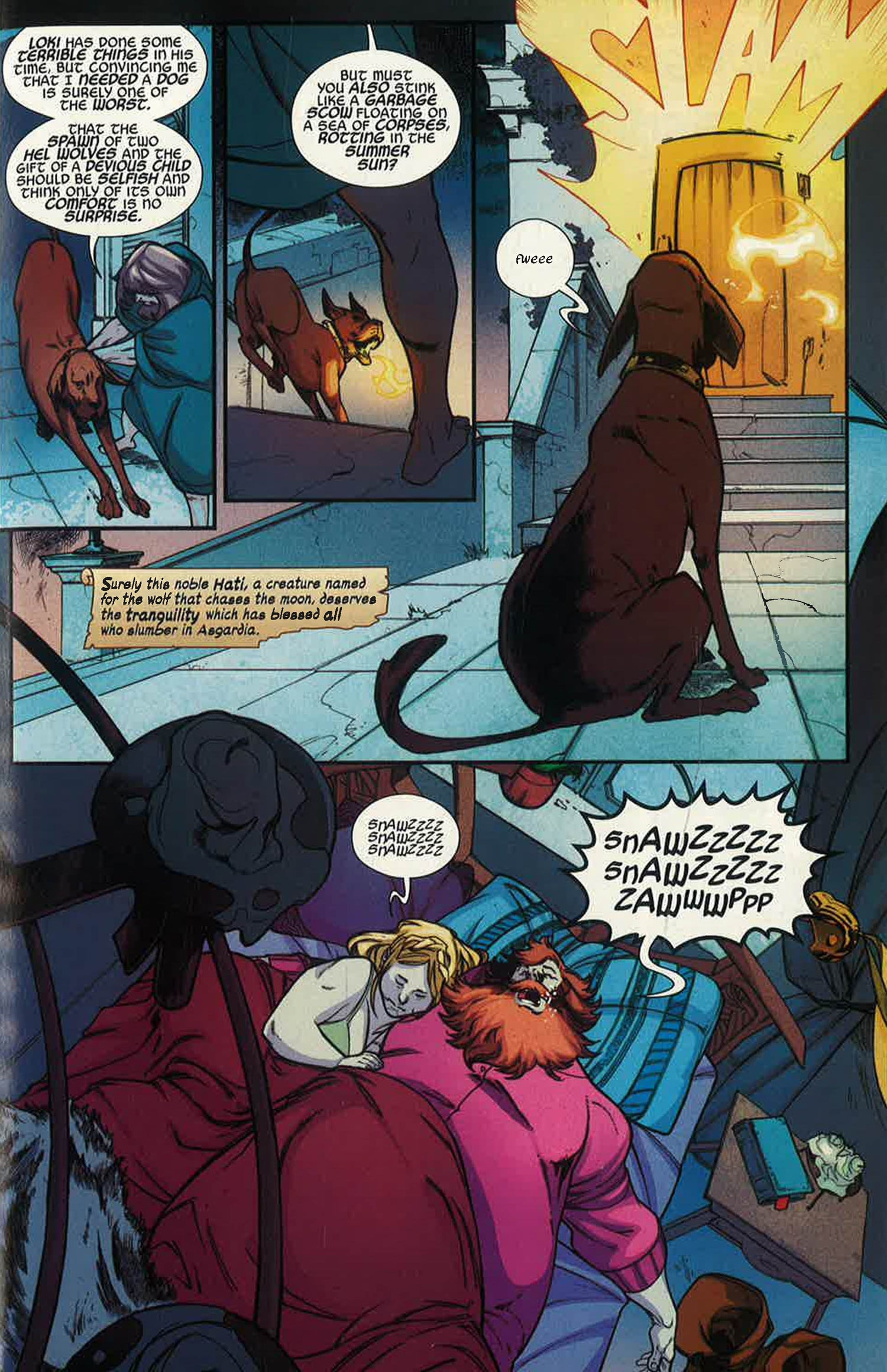 Mayhem in the mess hall! Horror in the hash house! Volstagg's daughter, Hildegund, only wanted a midnight snack...but something else is rampaging in the lower kitchens of Asgardia, and she's going to have to wake the whole house to fight it. To the rescue come Sif! Thor! The Warriors Three! And even Heimdall's dog! All these doughty heroes join forces to chain the vicious beast once and for all. But unfortunately, everything they need to do it...never existed! Then: he's back, baby! That's right, Beta Ray Bill has returned! After her most recent misadventures, Sif is working hard on getting her berserker rages, emotions and feelings back under control. However, when a certain hammerwielding, space-faring ex shows up...all bets are off!